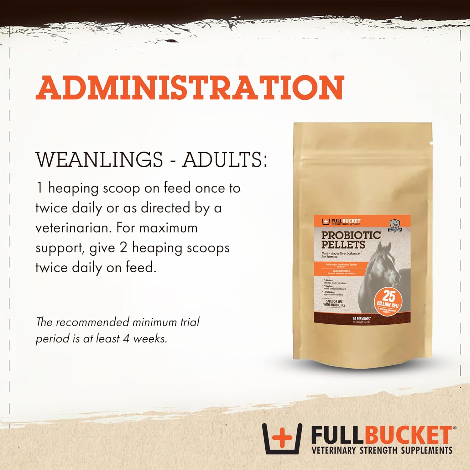 FullBucket Equine Probiotic Pellets provide digestive and immune support for horses through a veterinarian-formulated blend of probiotics, prebiotics, and yeast. Each serving delivers billions of live beneficial microorganisms to help maintain a healthy gut microbiome, improve nutrient absorption, and support consistent digestion during times of stress, travel, or diet changes. Designed for daily use, these palatable pellets promote optimal digestive balance for performance horses, seniors, and young horses alike. FullBucket’s high-quality, research-backed formula contains no artificial fillers or unnecessary ingredients—just proven gut health support that keeps your horse feeling strong, focused, and comfortable. Plus, with every bucket purchased, FullBucket donates a nutritional supplement to animals in need through their “Buy One, Give One” program, ensuring better health for horses everywhere.