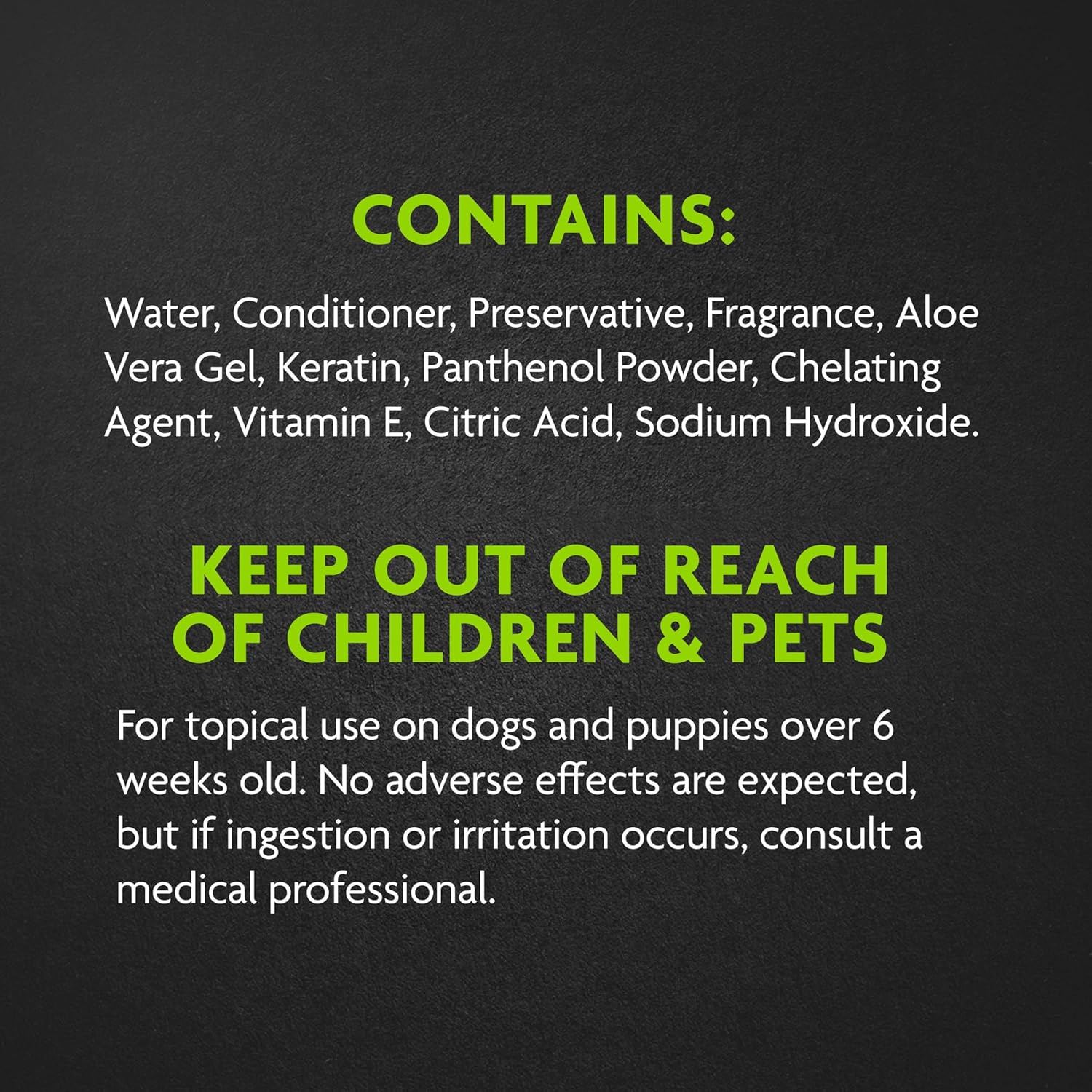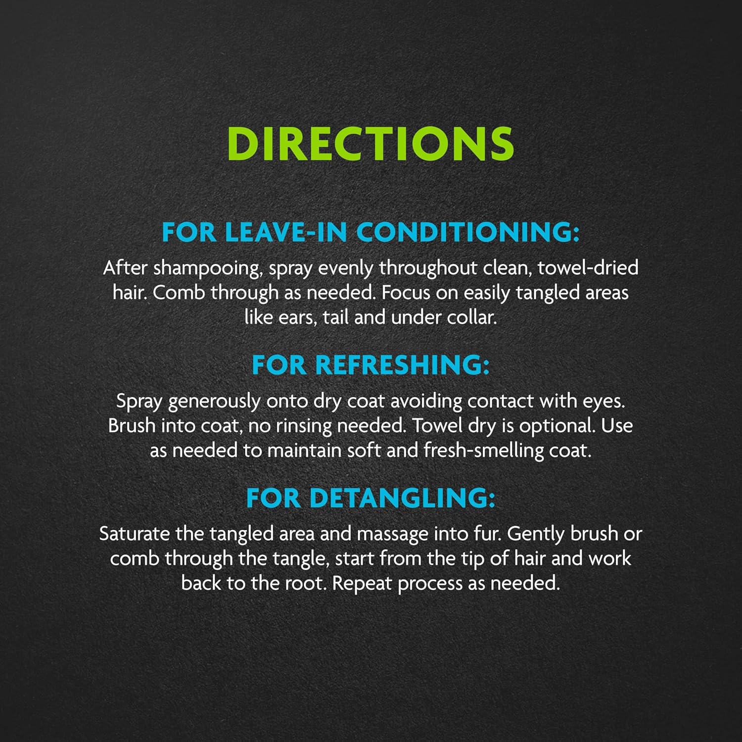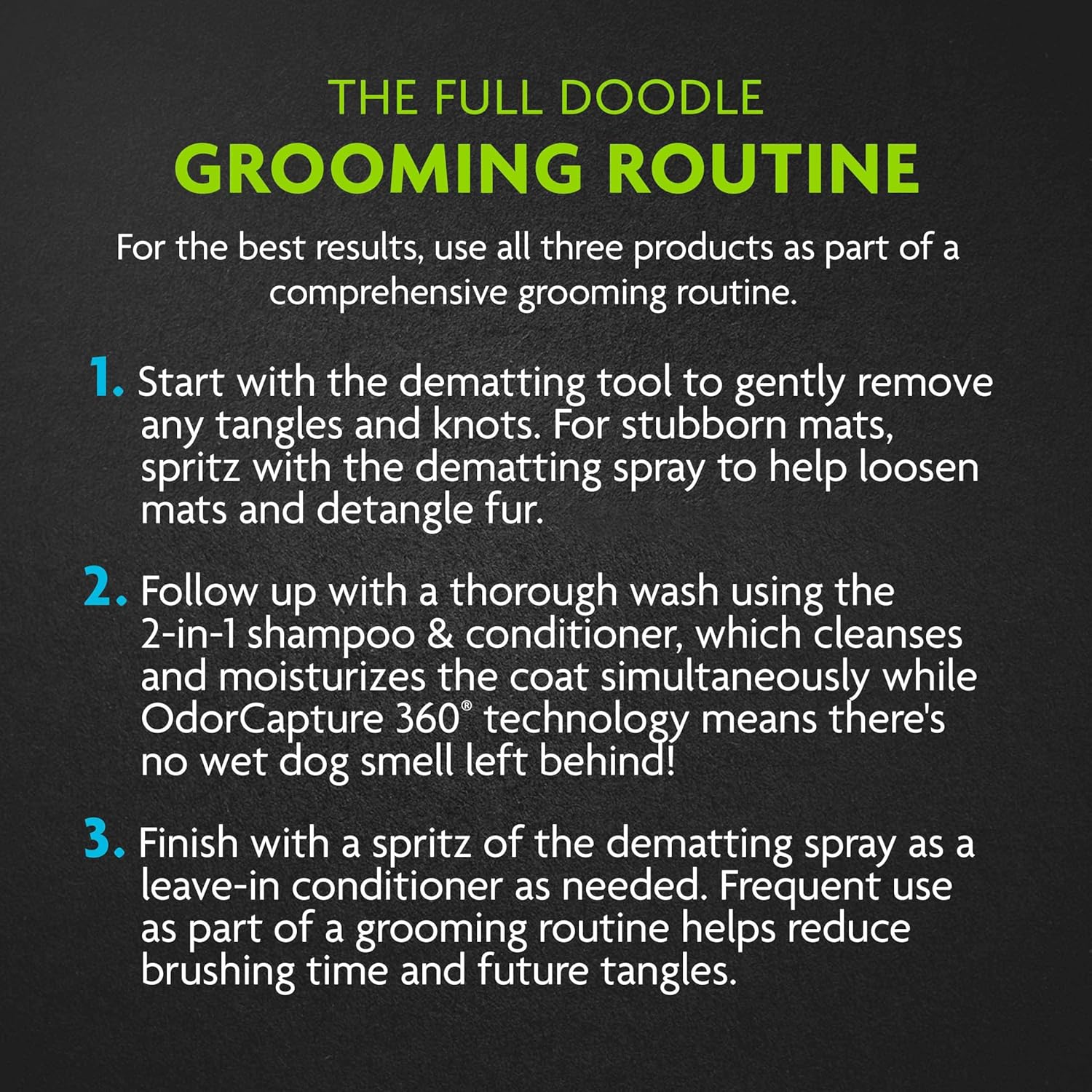- Directions: For Leave-in Conditioning After shampooing, spray evenly throughout clean, towel-dried hair. Comb through as needed. Focus on easily tangled areas like ears, tail and under collar. For Refreshing Spray generously onto dry coat avoiding contact with eyes. Brush into coat, no rinsing needed. Towel dry is optional. Use as needed to maintain soft and fresh-smelling coat. For Detangling Saturate the tangled area and massage into fur. Gently brush or comb through the tangle, start from the tip of hair and work back to the root. Repeat process as needed. Contains Water, Conditioner, Preservative, Fragrance, Aloe Vera Gel, Keratin, Panthenol Powder, Chelating Agent, Vitamin E, Citric Acid, Sodium Hydroxide. Keep Out of Reach of Children & Pets For topical use on dogs and puppies over 6 weeks old. No adverse effects are expected, but if ingestion or irritation occurs, consult a medical professional. The Ultimate Doodle Grooming System Helps avoid the dreaded “shave down” at the groomer The Full Doodle Grooming Routine For the best results, use all three products as part of a comprehensive grooming routine. 1. Start with the dematting tool to gently remove any tangles and knots. For stubborn mats, spritz with the dematting spray to help loosen mats and detangle fur. 2. Follow up with a thorough wash using the 2-in-1 shampoo & conditioner, which cleanses and moisturizes the coat simultaneously while OdorCapture 360® technology means there's no wet dog smell left behind! 3. Finish with a spritz of the dematting spray as a leave-in conditioner as needed. Frequent use as part of a grooming routine helps reduce brushing time and future tangles.