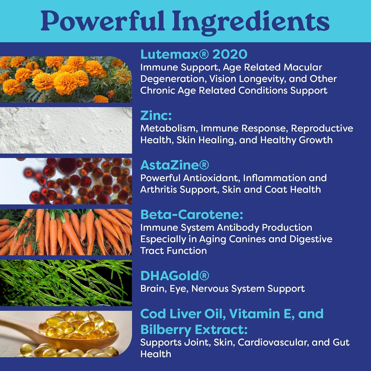 About this item Healthy Aging Hip & Joint Support – Formulated with DHA (from algae), antioxidants, and essential nutrients to help support mobility, flexibility, and everyday movement in senior dogs. Cognitive & Eye Health Support – Powered by Astaxanthin (AstaZine) and Lutein (Lutemax 2020) to help support brain function, focus, and vision as dogs age. Skin & Coat Nourishment – Includes Omega fatty acids, Vitamin E, and Zinc to help maintain healthy skin and a soft, shiny coat while supporting overall wellness. Immune System Support – Rich in antioxidants and age-supportive nutrients to help support your dog’s natural immune defenses throughout the senior years. Formulated Daily Soft Chews – An all-in-one healthy aging supplement made with premium ingredients and no wheat, corn, or soy. Easy to chew and great-tasting for daily use. › See more product details