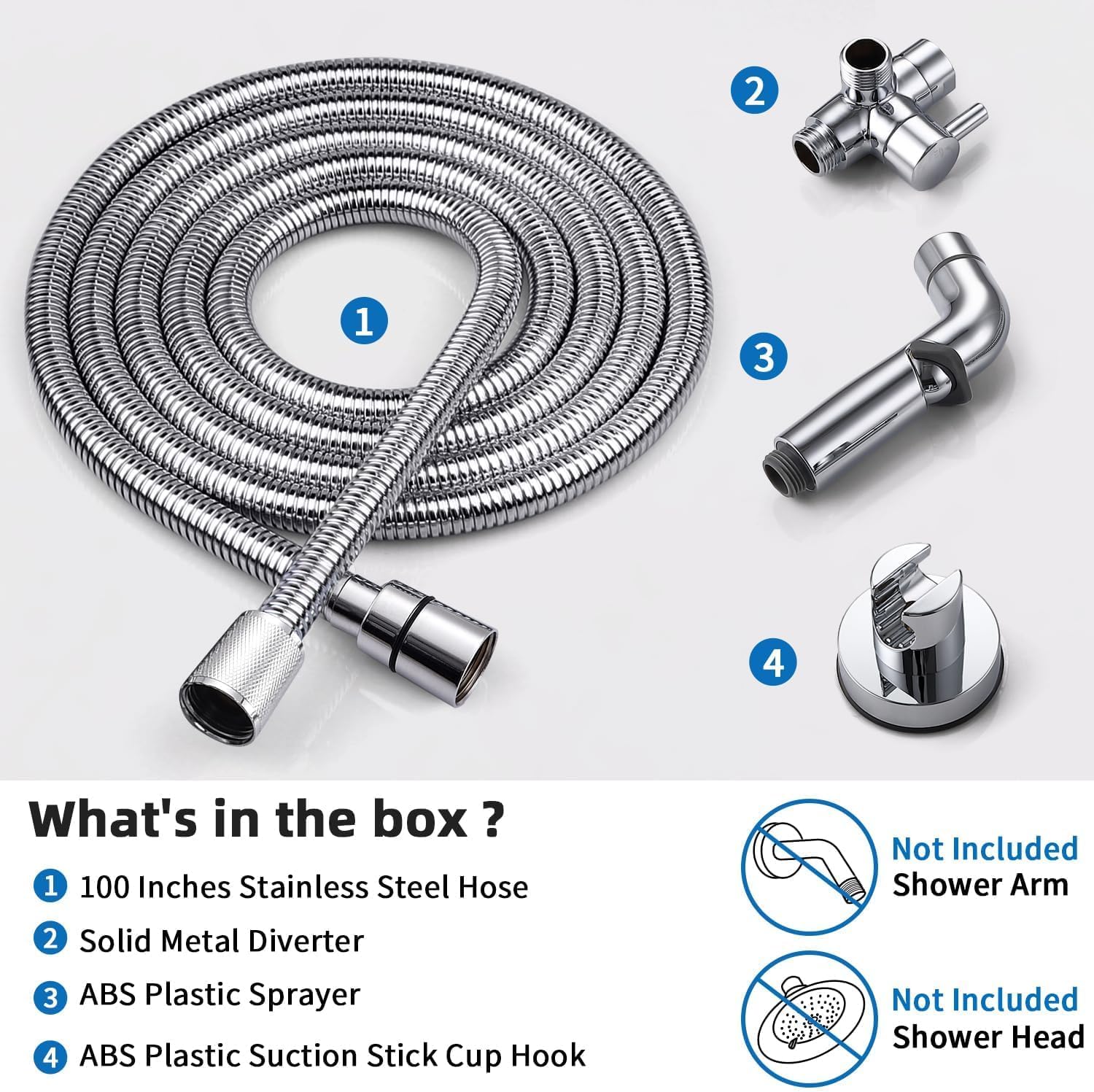 - Included Components: Shower sprayer, Diverter, Hose, Suction cup