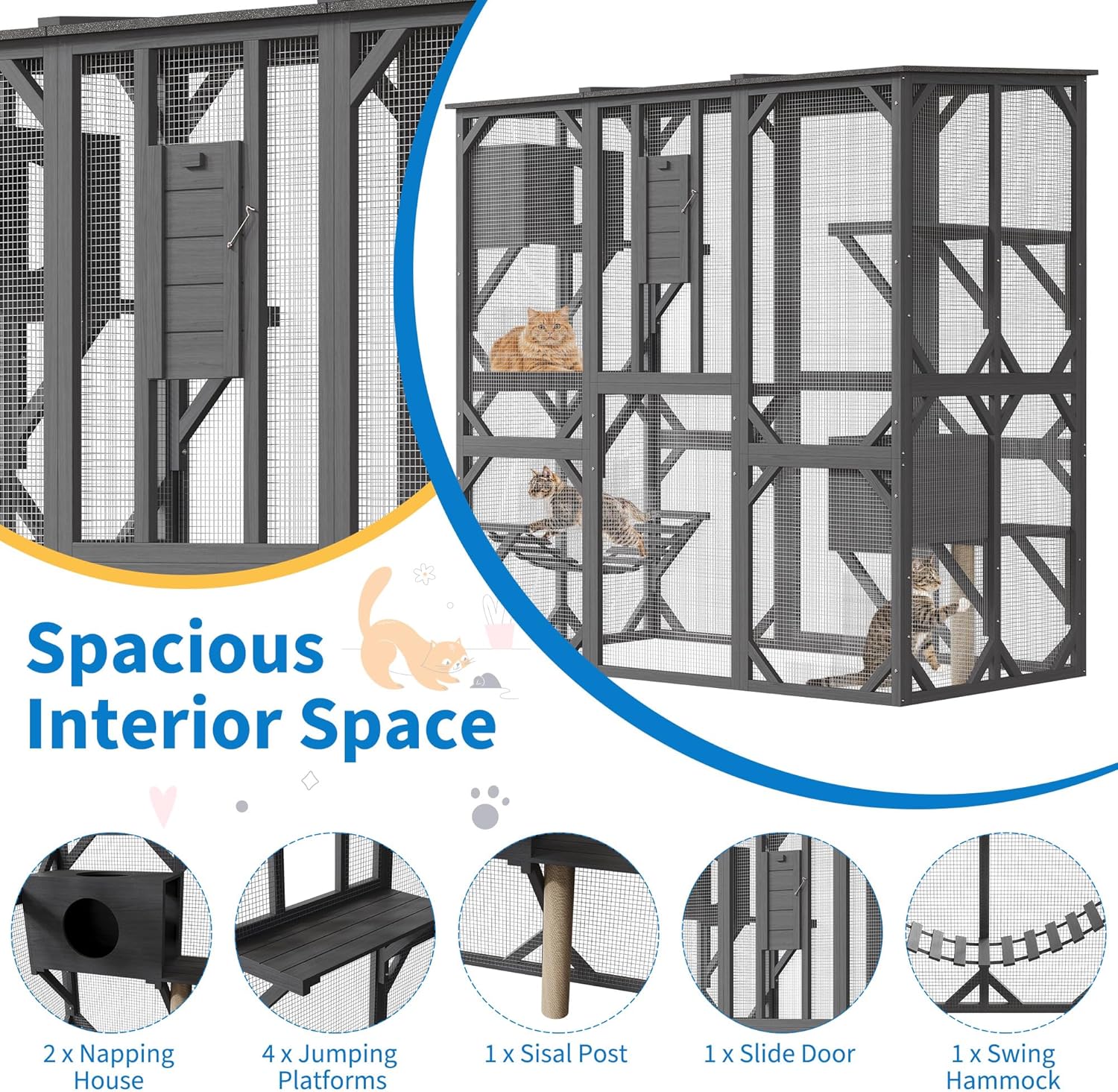 About this item Interactive Outdoor Cat House: Equipped with 4 platforms and a comfortable hammock, it provides your cat with unlimited space to play, climb, and relax. Two comfortable sleeping rooms at different heights provide your cat with a safe and private space to rest and sleep. Sturdy Construction: This cat catio is made of high-quality fir wood and durable galvanized wire mesh, ensuring a safe and ventilated environment. Each platform can support up to 40 pounds, allowing your cat to explore and interact comfortably in a safe space. Weatherproof Roof: This large outdoor catio with sliding windows features a black-gray asphalt roof, providing cool shade on sunny days. It is waterproof and rainproof, protecting it from the elements, keeping your pet dry and comfortable. Easy Access: The 70-inch high walk-in cat house allows you to come and go freely and interact with your furry friend. High-quality metal snap locks ensure their security. It also simplifies daily activities like feeding and playing, allowing you to spend more quality time with your cat! Suitable for All Breeds and Ages: The outdoor patio cat enclosure platform adopts a stepped design, allowing cats to move up and down easily. The cat house with a sleeping house provides a soft and warm resting place.The small sliding door on the back can be connected to the window for your cat to enter and exit the home freely. › See more product details