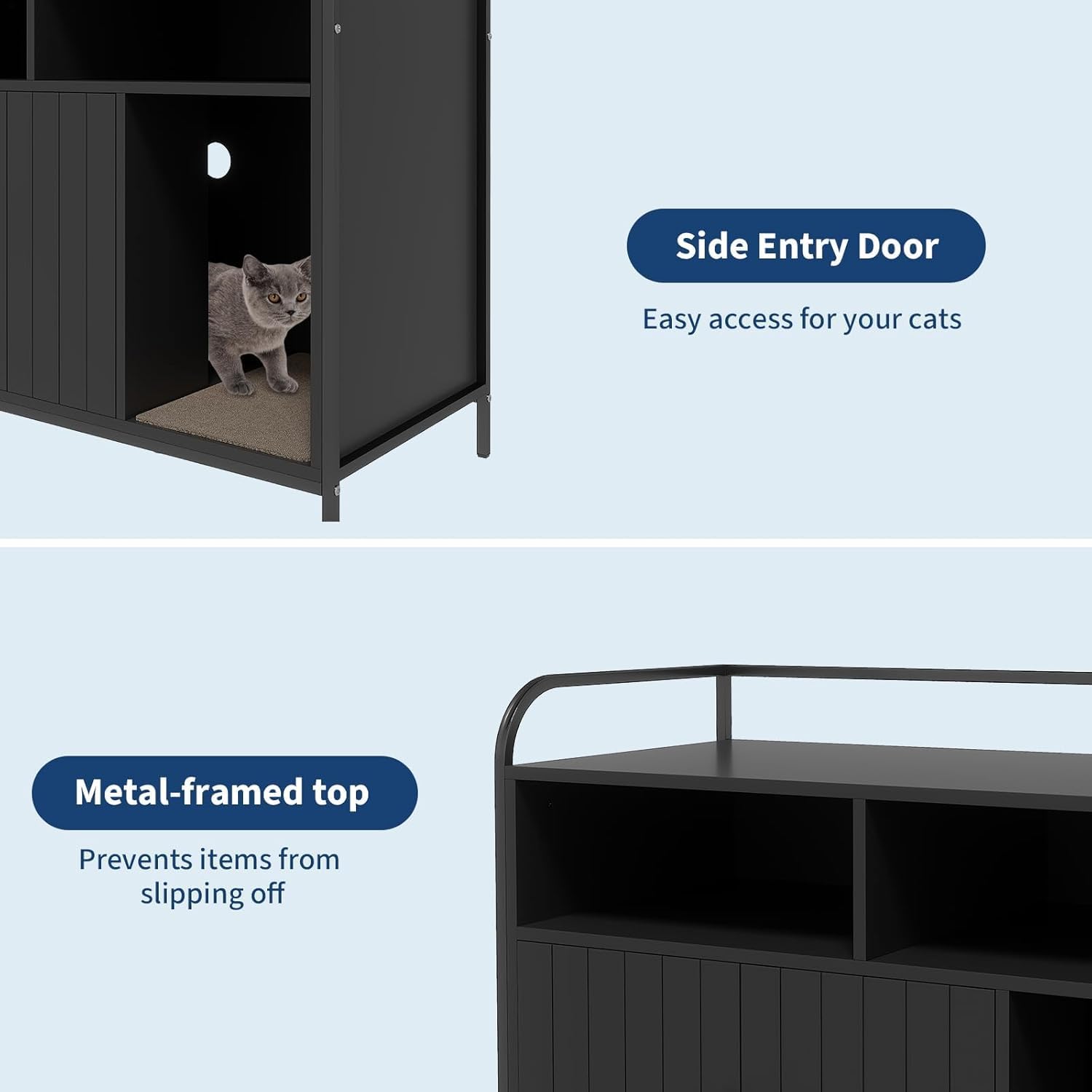 Transform Your Home with a Stylish Cat Litter Box EnclosureGive your cat a private, comfortable haven while enhancing your home’s style and cleanliness with this modern cat litter box enclosure. Thoughtfully designed to discreetly hide your cat’s litter box within elegant furniture, this enclosure keeps unsightly trays and scattered litter out of view—perfect for living rooms, bedrooms, or hallways.Spacious Compatibility: The generous 37.40”L x 17.72”W x 32.28”H interior fits most large and standard cat litter boxes, allowing cats ample room to move comfortably.Elegant Modern Design: Featuring a sleek white finish with gold accents, this piece blends seamlessly into contemporary, rustic, or minimalist décor—doubling as a stylish side table or bench.Ventilated & Odor Controlled: Well-placed ventilation panels promote airflow and help control odors, keeping your home fresh and inviting.Easy Access & Cleaning: Wide doors and practical side entrances make cleaning and access simple for both kittens and senior cats.Clever Storage Shelf: A built-in top shelf provides space to neatly organize pet supplies, bags, scoops, or decorative items, keeping your home tidy and clutter-free.Eco-Friendly & Durable: Constructed from high-quality, eco-friendly particle board for lasting durability and a greener home environment.Multi-Functional & VersatileThis indoor cat house is ideal for apartments, small homes, or multi-cat households. It serves as hidden litter box furniture, storage cabinet, and pet cat house—offering a sophisticated, dog-proof hideaway for your litter system and a neat solution for your pet’s needs.Important Notes:Fits most standard cat litter boxes—please check internal dimensions before purchase.Assembly required; follow included instructions.For pet use only; not intended as a seat or to support excessive weight.Upgrade to this modern litter box enclosure for a cleaner, more organized, and beautiful living space for both you and your feline companions.