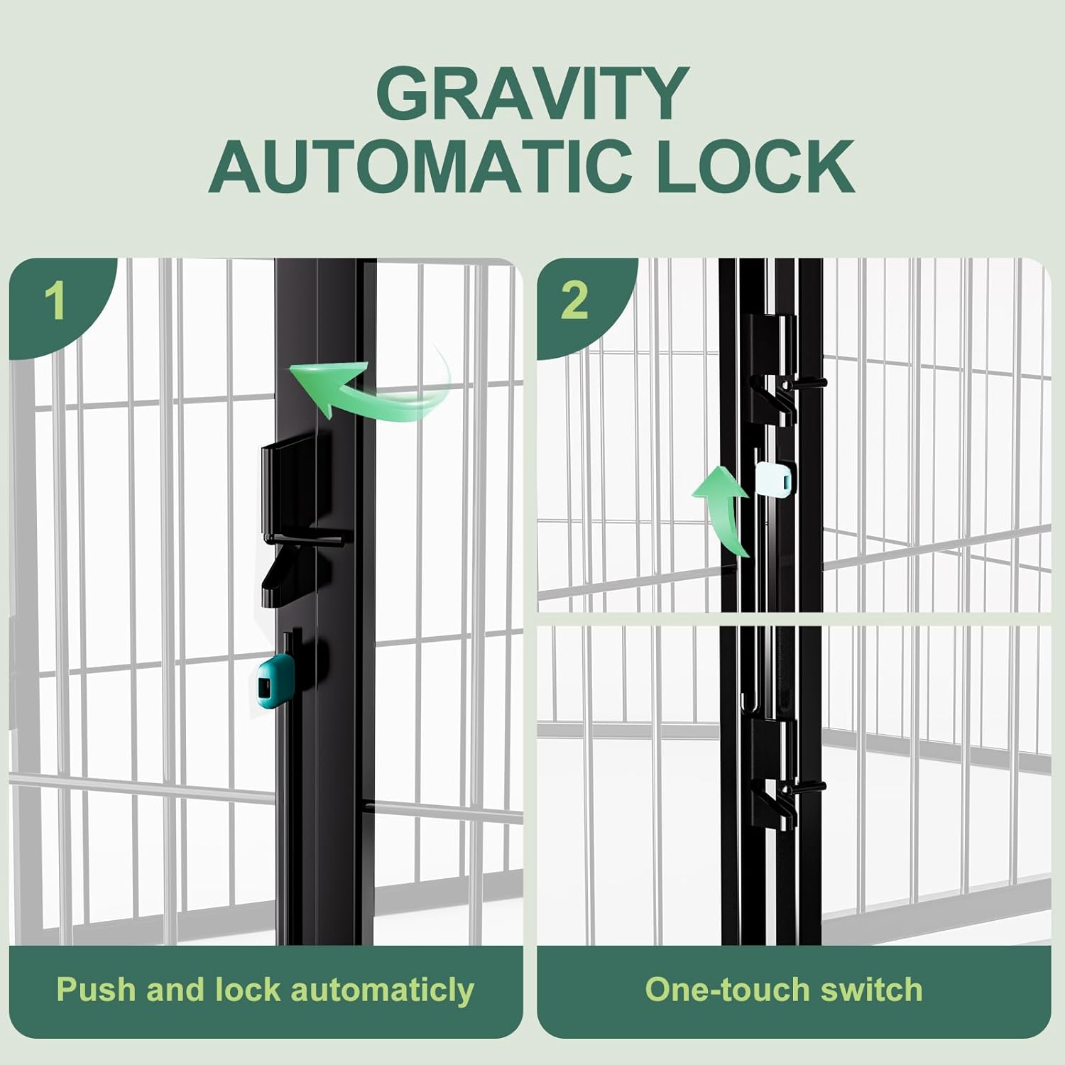 About this item A Win-Win Solution: The Gardner Pet Dog Playpen is different from a traditional enclosure cage or kennel, our dog pen provides a spacious semi-open activity area specifically for your lovely dog. Your dog can run and play happily and freely in this dog exercise play.Meanwhile, you could unlock your freedom without worry about your pets. Safe & Sturdy: The stakes are designed with rounded ball tops to protect the dog's claws from injury. Smooth surface without burrs, the stakes are more easily inserted into the ground for more stability and rigidity. Won't collapse when the dog leans against them. But pleae remember to take off the leash before you put the dog in to avoid injuries caused by your dog hanging from the stake while jumping. Threshold-Free Gate With Gravity Lock: Adopts new type door lock design - one-touch switch, much safer and more convenient. The automatic gravity-actioned locking mechanism will ensure you can open and close the door smoothly and reduces the chance of dogs unlocking by themselves. Threshold-free gate allows easy walk-in cleaning for humans and worry-free running for dogs. Easy Assemble & DIY Shapes: The panels could be assembled in just a few minutes without toolsdue to the rod-connected design. You could DIY the dog pen to any shape you need like square, rectangle, round, etc. Our pet play pen could be disassembled into a flat and compact size for space saving and easy carrying, perfect for travel, RV camping or play in the yard. Anti-Rust Paint Finish: The Gardner Pet pet playpen features anti UV material, anti-rust, and waterproof, that will help protect extend its life. Smooth surface will be easy to clean.When used indoors, we recommend placing it on carpet to prevent the rods from scratching the floor, or please try our dog pee pad for the same purpose.100% satisfactory resolution in case of any issues. › See more product details
