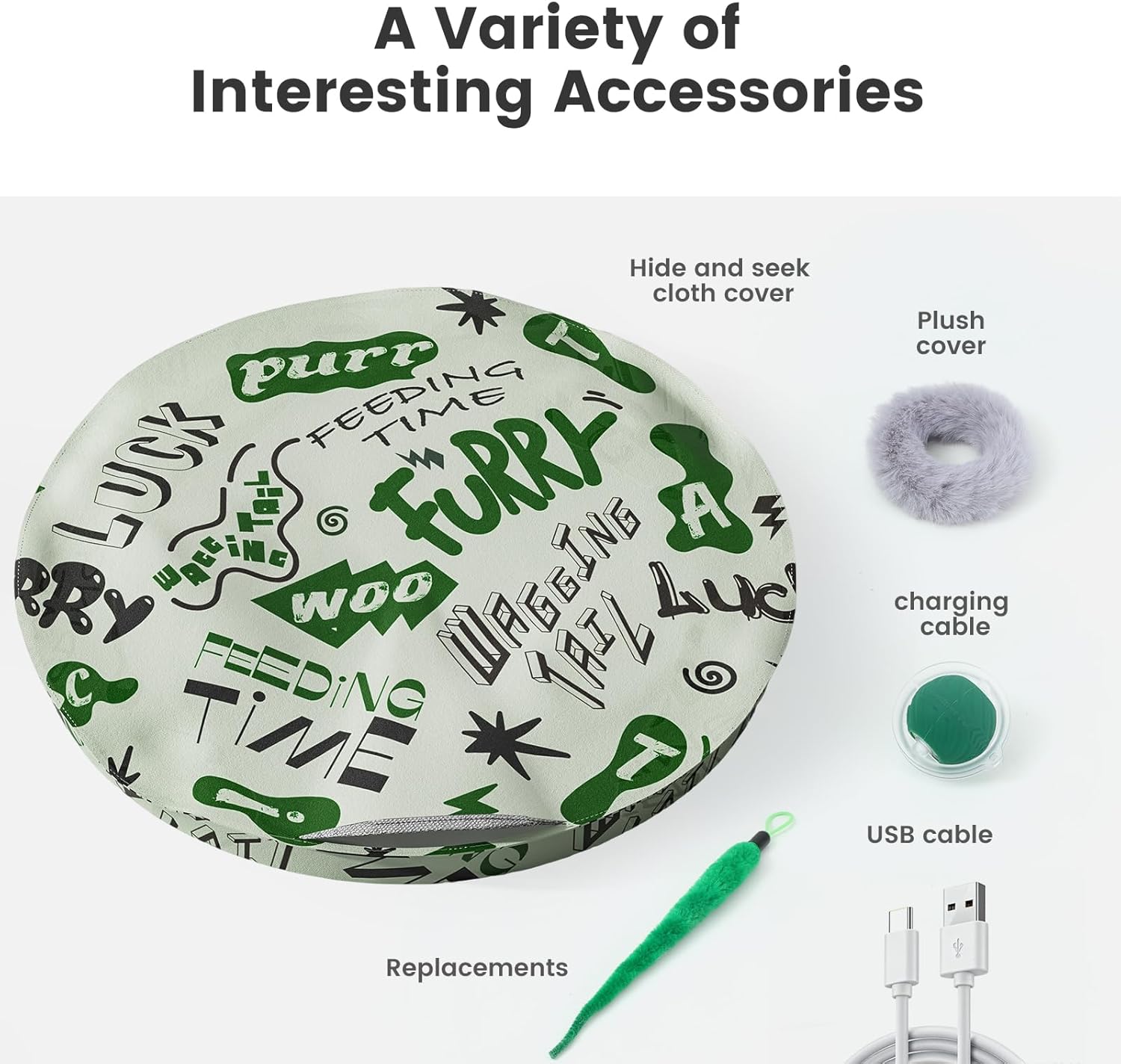 - Included Components: Ball, hide and seek cloth cover, charging cable, plush ring, tail accessories