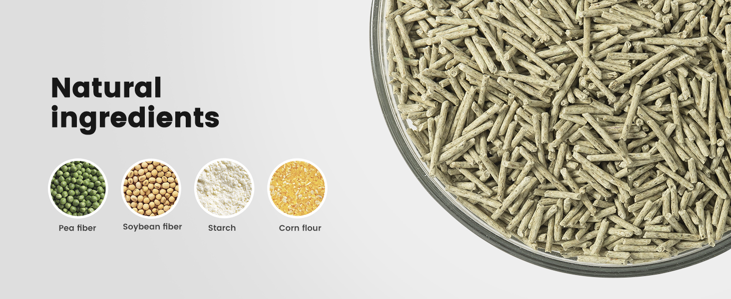 About this item 100% Natural Ingredients for Your Cat's Safety -- Made from corn starch, pea fiber, soybean residue, and green tea extract. Free of artificial colors and fragrances, providing a safe, chemical-free environment for your feline friends. Superior Clumping and High Durability -- Quickly absorbs moisture in ≤15 seconds, forming tight clumps that withstand drops from up to 1.2 meters without breaking. Makes cleanup effortless and mess-free. Dust-Free and Allergy-Friendly -- With a dust rate of ≤0.5%, our cat litter ensures cleaner air and reduces respiratory irritation for cats and their owners, making it perfect for sensitive households. Odor Control with Natural Green Tea Extract -- Contains 10% green tea powder and natural deodorizing agents to neutralize unpleasant odors, leaving your home fresh and inviting. Water Soluble and Flushable -- This tofu cat litter is designed to be flushable, making it simple and quick to dispose of while saving you time and effort during cleanup. Perfect Size and Quality Standards -- 0.07in~0.08in small diameter hasmore efficient water absorption and compactibility, with a hardness of ≥40N ensures optimal comfort for your cat's paws while preventing scattering. › See more product details