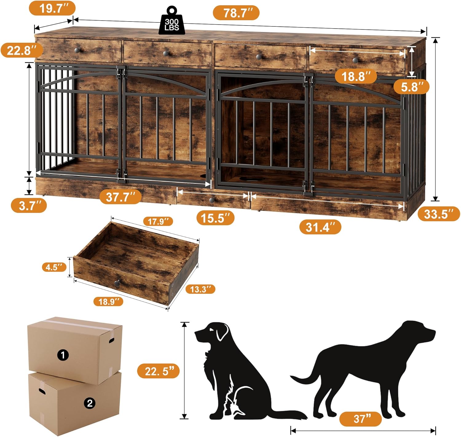 - Included Components: main structure (wooden+metal), drawers, feeding bowls