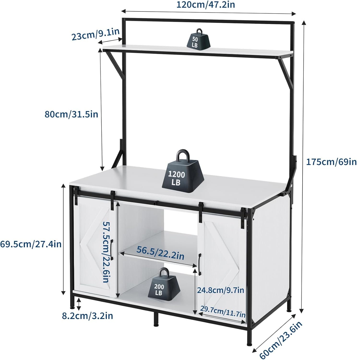 About this item UP TO 120-GALLON REPTILE TANK:: With a desktop size of 48" X 24", this stand is ideal for reptile terrariums or aquariums ranging from 40 to 120 gallons. Made especially for bearded dragon owners. STURDY AND STABLE:: Built to last with quality materials, including thick 1.5-inch steel pipes and strong MDF boards. It can hold up to 1200 LBS on the top and 200 LBS on the bottom shelf. BUILT-IN POWER OUTLETS & USB PORTS:: Features 2 AC outlets, 2 USB ports, and a power switch. This makes it easy to plug in and control lights, heaters, or foggers, helping you keep everything tidy and well-organized. LARGE STORAGE SPACE: Comes with stylish sliding barn doors that open and close smoothly. The cabinet inside offers plenty of room to hide food, tank decorations, and bigger items like foggers, keeping all your supplies neat and within reach. DISPLAY SHELF ON TOP: The top shelf is perfect for showing off your favorite plants, pictures, or decorations. It helps create a beautiful and balanced look together with the terrarium below. MANUAL INCLUDED: Everything you need is in the box, including clear instructions and labeled parts. Putting it together is quick and easy. › See more product details