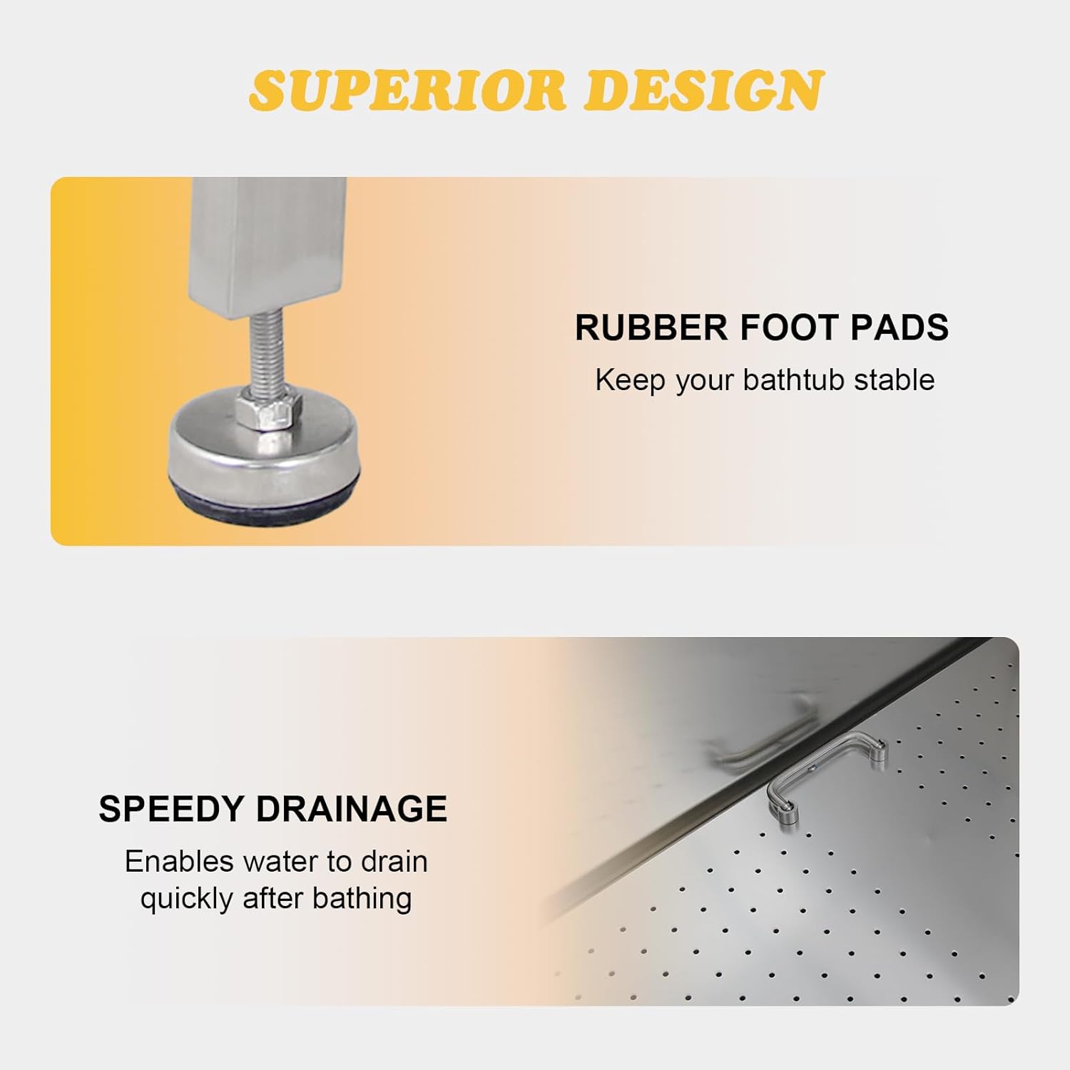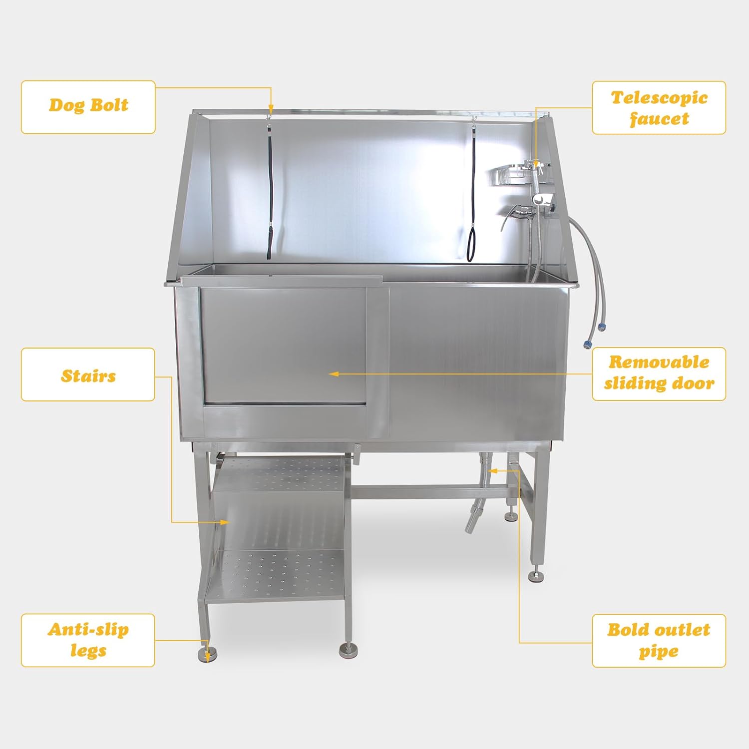 Generously-Sized Tub: This pet grooming tub provides ample room for dogs of various sizes, accommodating pets up to 300lbs. Premium Stainless Steel Build: Crafted from durable 304 stainless steel, this tub is resistant to deformation, rust, and scratches for long-lasting use. Adjustable Faucet and Sprayer: Equipped with hot and cold water controls, plus a high-pressure sprayer, for a customized and comfortable bathing experience. Pet-Friendly Design: Features a safety step ladder for easy access, removable stairs for space-saving convenience, ensuring a pet-friendly grooming experience. Comprehensive Accessories: Includes a non-skid mat, self-cleaning brush, grooming glove, drainage kit, shampoo rack, play ball, and fixing ropes for a complete grooming setup. › See more product details
