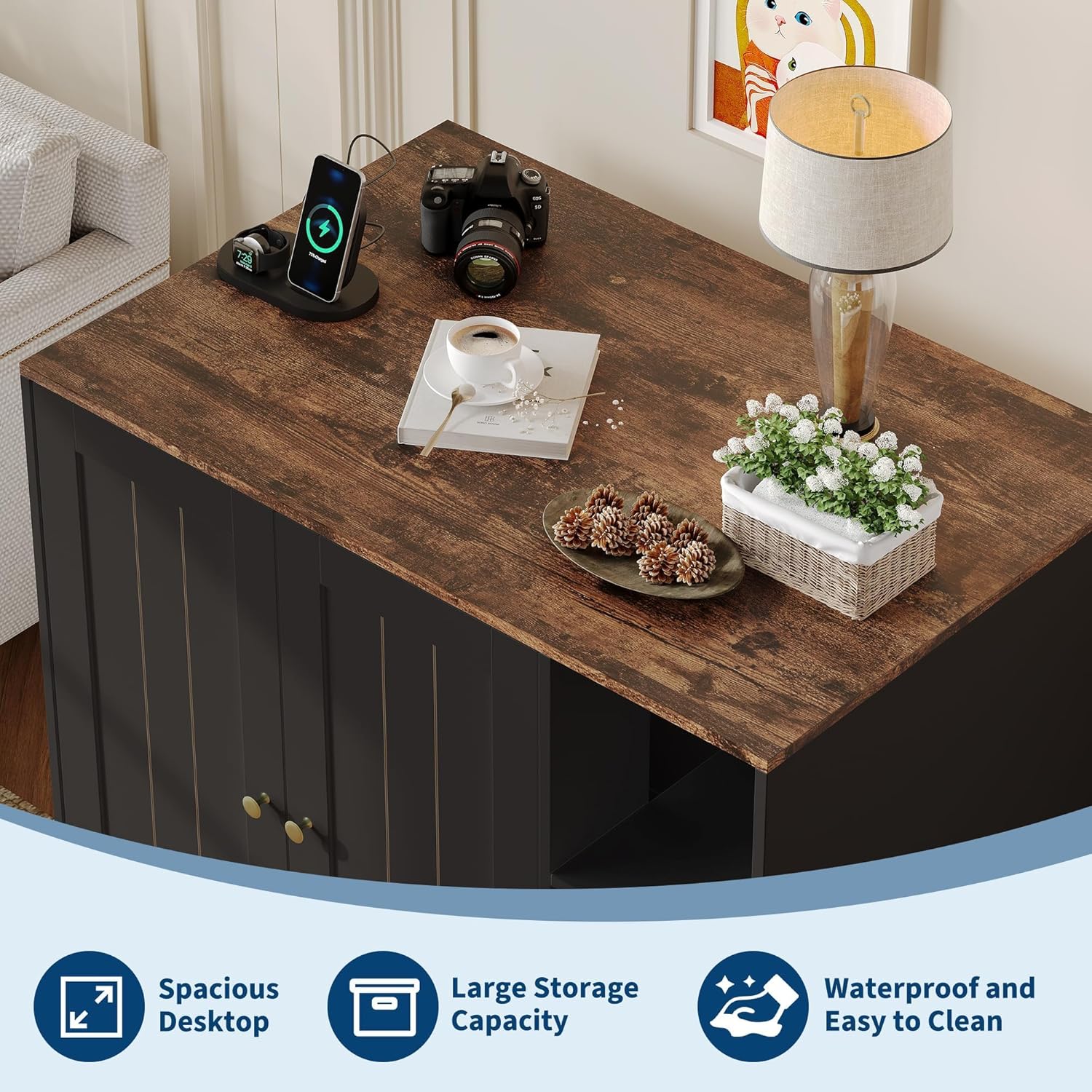 Large Cat Litterbox Robot EnclosureFeatures:- Spacious interior fits most litter boxes, including self cleaning litter box- Built-in charging station for convenient device and gadget charging - Dual entrances allow flexible access for cats- two-door design make cleaning easier for owners - Scratch pad provides a healthy outlet for cats and helps protect your furniture - Durable engineered wood ensures stability and long-lasting use - Farmhouse style design doubles as a decorative side table- Tabletop and open shelf keep litter scoops and accessories organized and accessible - Easy assembly with clear instructions and labeled partsSpecification:Weight capacity: 150 LBSize: 39.37 in x25.98 in x32.87 in Color: white / blackMaterial: engineered wood Packing list:1x Cat litter box enclosure1x Hardware pack1x Assembly instruction