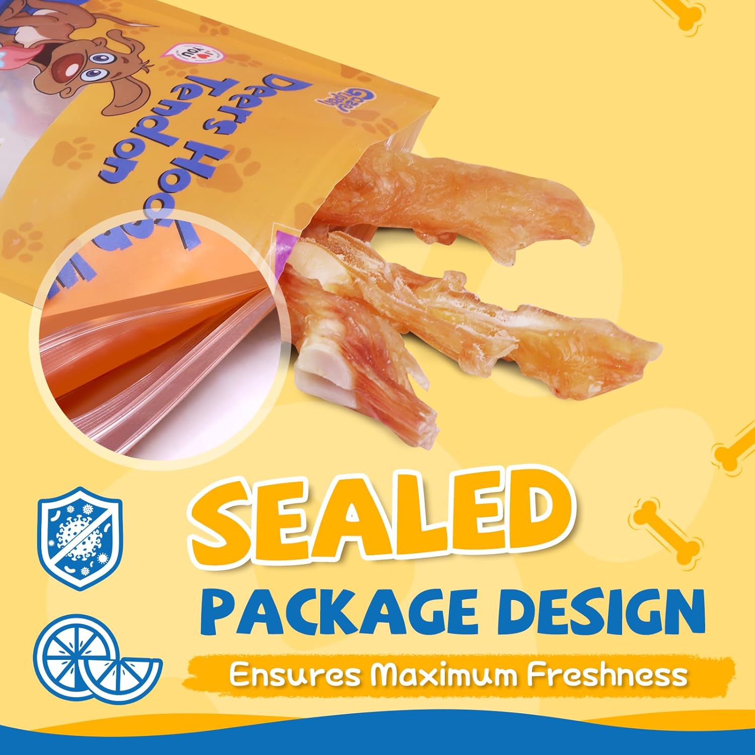 About this item Single Ingredient: Made from 100% raw-cut deer hooves tendon, offer a completely natural and single-ingredient option for pet owners seeking pure, wholesome snacks for their furry friends. Long-Lasting Chews: Our tendon dog treats provide a tough and durable chew that can keep dogs entertained for hours, helping to satisfy their natural chewing instincts and reduce boredom. Promotes Dental Health: Chewing on tendons helps to scrape away plaque and tartar buildup, promoting better oral hygiene and fresher breath, making these treats beneficial as well as enjoyable. High in Protein: Rich in natural protein, these chews support muscle maintenance and overall health, providing your pet with the nutrients they need for energy and vitality. Rawhide Free: Our venison tendon dog chews provide the chewing satisfaction pets crave without the potential risks associated with rawhide, ensuring a worry-free treat experience for your furry friend. › See more product details