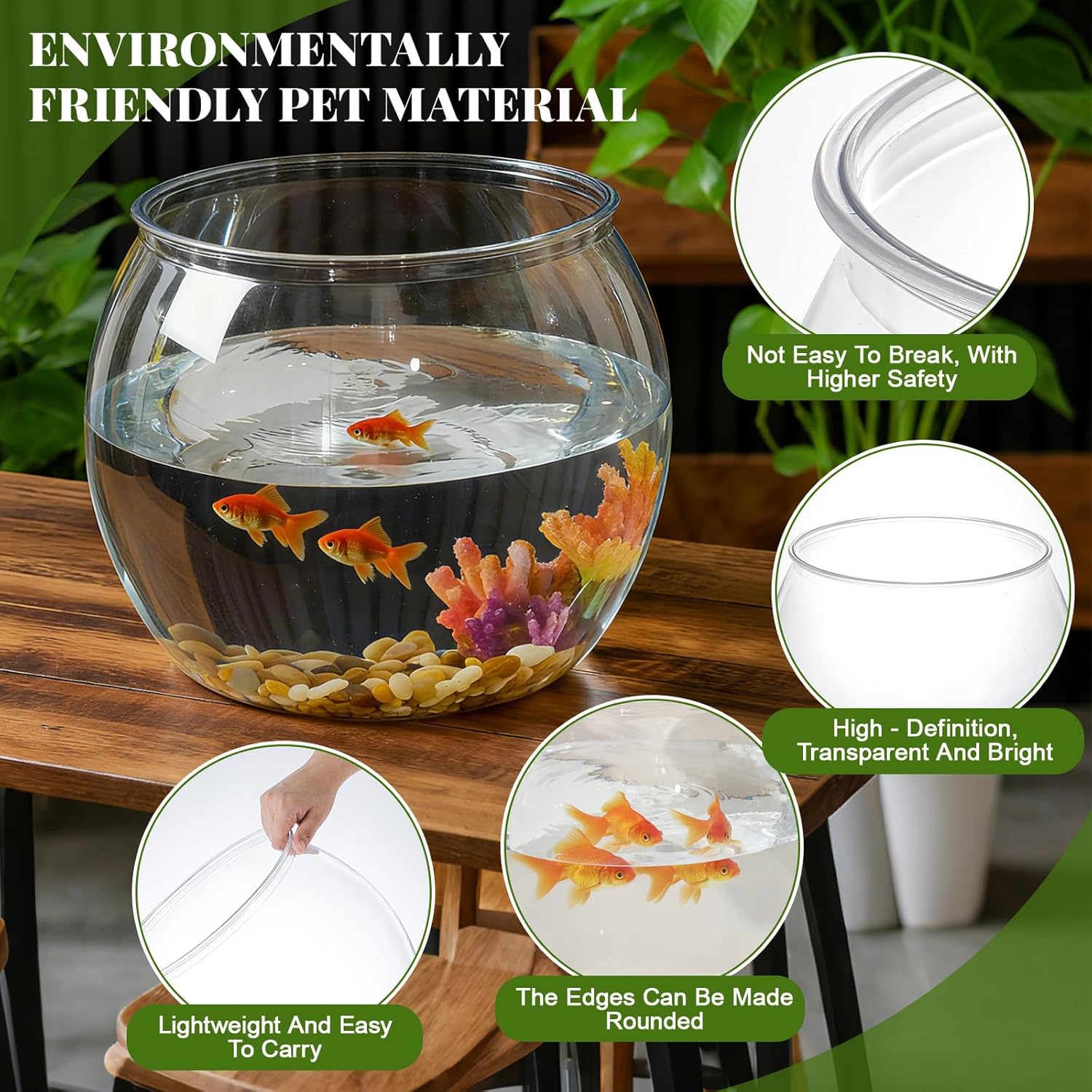 Features: This plant bowl made of shatterproof plastic, unlike glass fish bowls that can shatter when dropped this durable bowl puts to rest any concerns This 5 gallon fish bowl is an ideal choice for those who care about sustainability. It is designed to withstand daily use while remaining a clear and attractive feature in any room. Specifications: Material: plastic Color: clear Size: 10.2 x 10.2 x 10.8 inches/ 26 x 26 x 27.5 cm Package includes: 2 X 5 gallon fish bowl Notes: Manual measurement, please allow slight errors on size. The color may exist a slight difference due to different screen displays