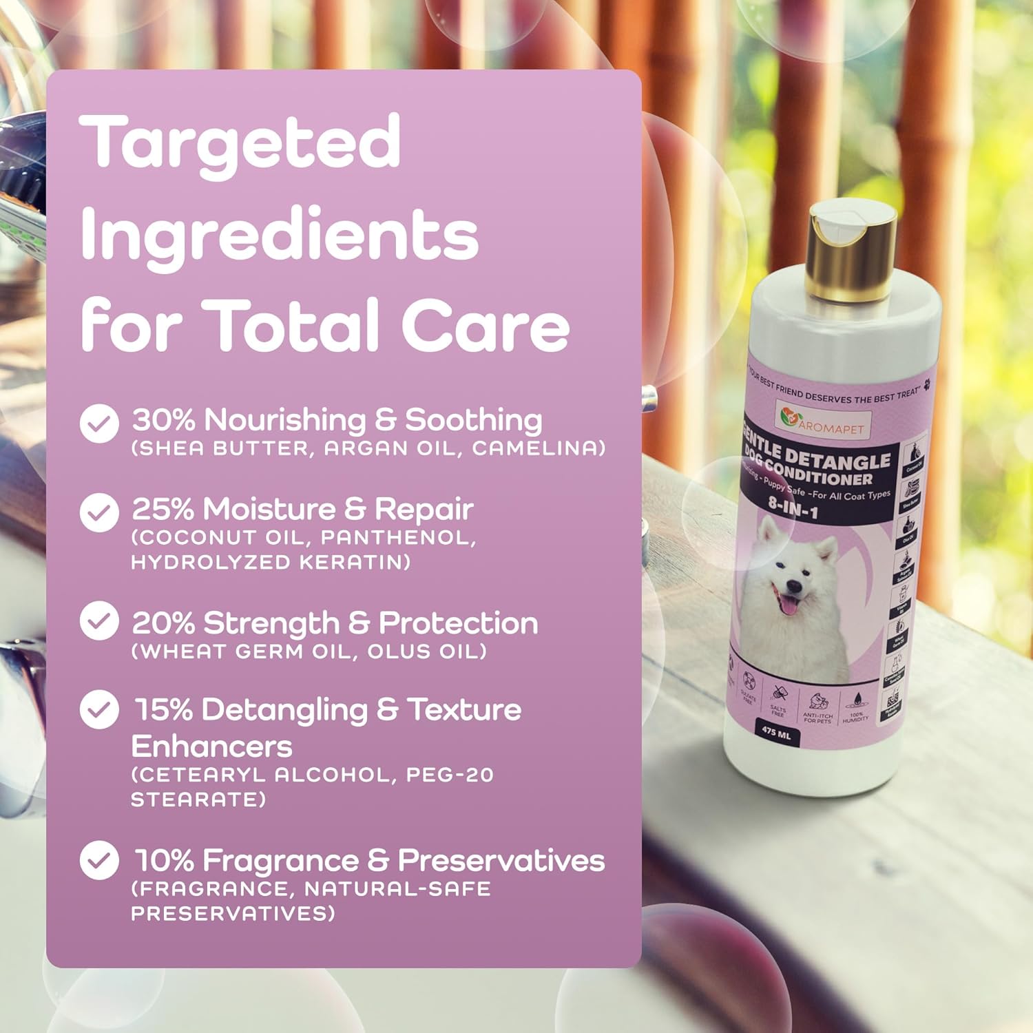 About this item 8-in-1 Nourishing Formula: Powered by coconut oil, shea butter, olus oil, argan oil, vitamin B5, wheat germ oil, camelina seed oil, and hydrolyzed keratin, this dog conditioner is designed to soften, moisturize, and help remove knots and mats from your dog’s coat; by smoothing the hair cuticles and reducing friction between tangled strands, it leaves fur silky, manageable, and easy to brush Detangles & Dematts: Works as a dog detangler and dog conditioner in one; ideal as a dog conditioner for matted hair and for long coats prone to tangles, our gentle formula helps reduce painful tugging and makes grooming stress-free Safe for All Breeds & Ages: Formulated for every pup, this dog conditioner is suitable for all dog breeds and gentle enough for sensitive skin; doubles as a puppy conditioner and dog conditioner for long haired dogs like poodles, yorkies, and goldendoodles Hypoallergenic & Natural: Made with natural ingredients and is gentle enough for use on dogs of all ages, including puppies; this hypoallergenic dog conditioner supports healthy skin and fur without harsh additives, parabens, or sulfates Fresh, Clean Finish: More than just a dog hair conditioner, this product leaves coats with long-lasting softness and shine; use it after shampoo as a deshedding dog conditioner or dog deep conditioner to refresh your pup’s coat 8-in-1 Formula for Total Coat Care – This premium pet conditioner moisturizes, detangles, soothes itching, softens fur, restores shine, calms sensitive skin, hydrates deeply, and protects the coat – all in one bottle. Suitable for both dogs and cats. Infused with Natural Botanical Oils – Powered by coconut oil, shea butter, olive oil, argan oil, chamomile extract, wheat germ oil, and camelina seed oil. These rich oils nourish and protect the skin and coat without causing irritation or buildup. Perfect for Itchy, Dry, or Sensitive Skin – The oatmeal-based formula helps relieve discomfort from dryness, flaking, or seasonal allergies while promoting long-lasting moisture and coat softness. Ideal for frequent use on allergy-prone pets. Free from Parabens, Sulfates & Salts – 100% clean and gentle. No harsh ingredients, no synthetic colors, and no added salts that dry out the skin. Safe for puppies, kittens, and senior pets with delicate skin. Silky, Shiny & Easy-to-Manage Coat – Leaves fur smooth, shiny, and tangle-free. Makes grooming easier and more pleasant while reducing breakage and leaving your pet smelling fresh and clean after every bath. Show more › See more product details