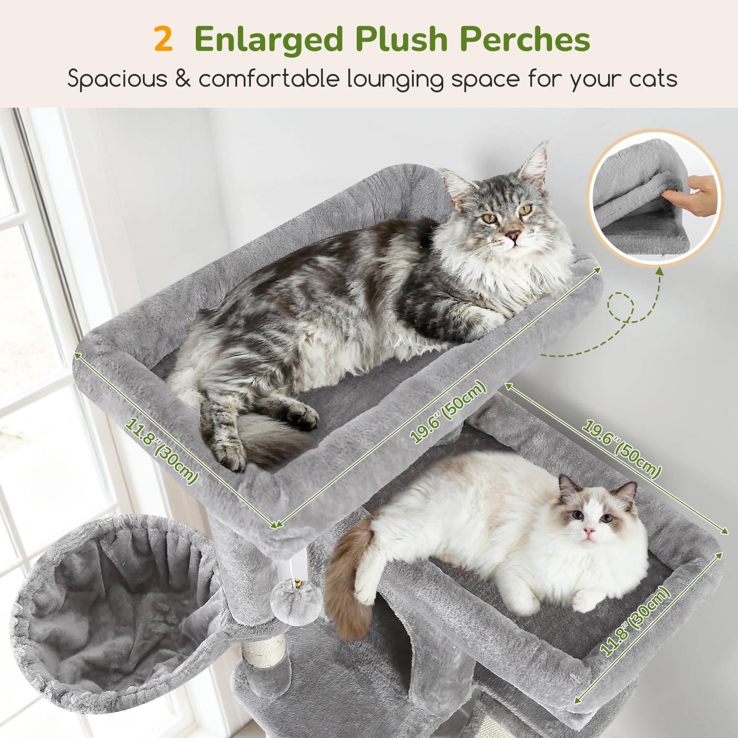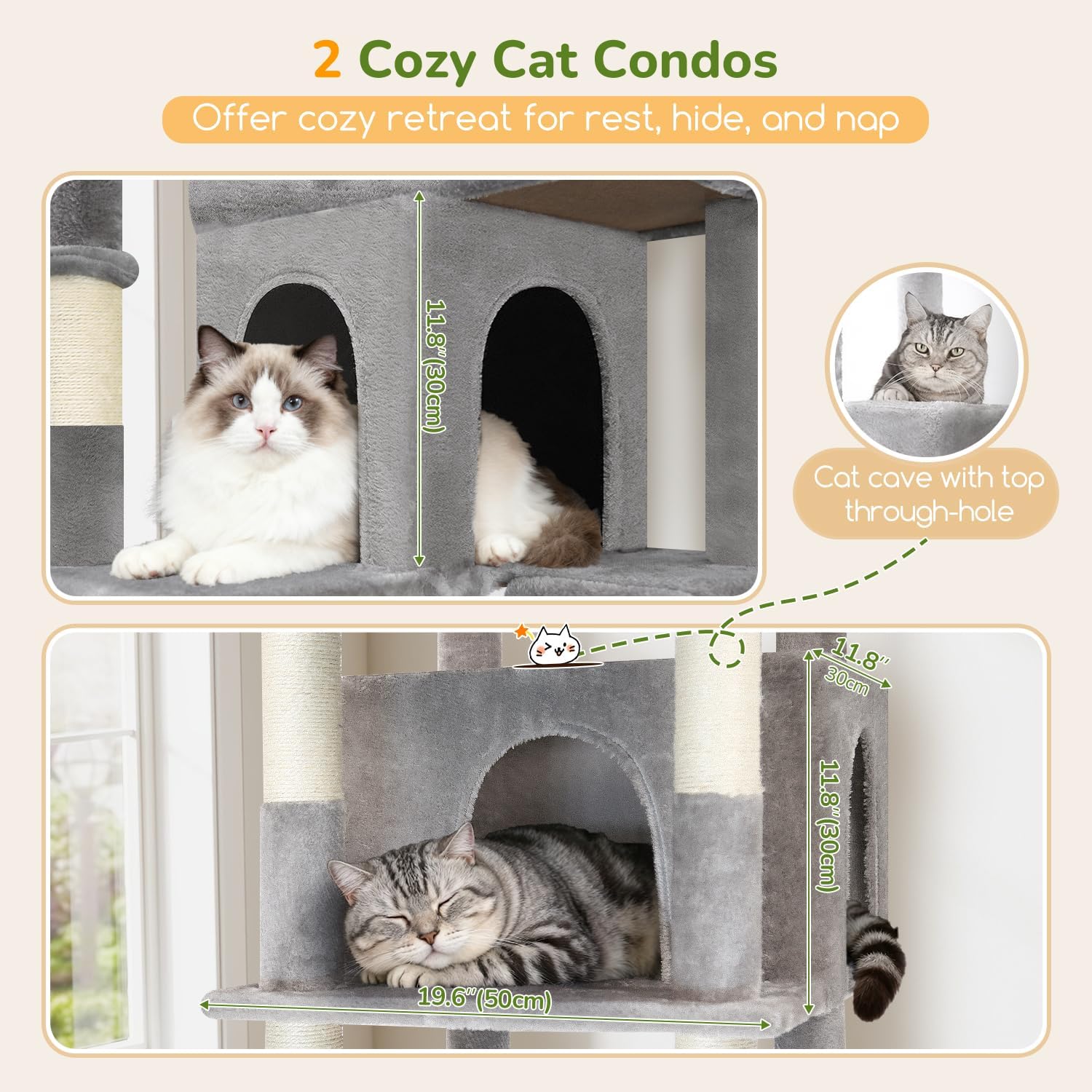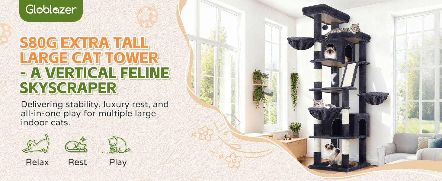 About this item Multi-Level Cat Tower: Designed specifically for multi-cat households, this 80-inch extra large cat tree tower seamlessly combines resting, playing, and climbing activities. It has several independent activity zones, fully catering to your cats' daily entertainment, relaxation, and vertical exercise needs, making it an ideal choice for homes with multiple felines 2 Deluxe Large Perches & Adjustable Baskets: Features two oversized top perches with detachable cotton covers for simple cleaning. Three hanging baskets are included, two of which are single-ear adjustable; simply rotate these to position the cat scratching tree snugly against walls or corners, which inherently increases base stability and minimizes shaking 2 Cozy Cat Condos: The cat condo tower includes two differently sized cat caves at different heights, suitable for cats of all sizes seeking privacy. The larger condo features a circular climbing outlet on top, facilitating upward exploration and satisfying their instinct to observe and explore from higher vantage points 6 Sisal Posts and Scratch Boards: This big cat tower with scratching post includes six natural sisal-wrapped posts and additional sisal scratch board ladder, providing ample scratching outlets for your indoor cats. This big cat tree tower also comes with three funny hanging toys to enhance the hunting experience and effectively keep your furniture safe from scratches Easy to Assemble: The S80G large cat tower is designed with a stable structure and a dedicated anti-tip device to ensure stability and safety. We provide a detailed manual, a full set of tools, and an online installation video to help you easily and quickly set up this cat furniture activity center › See more product details