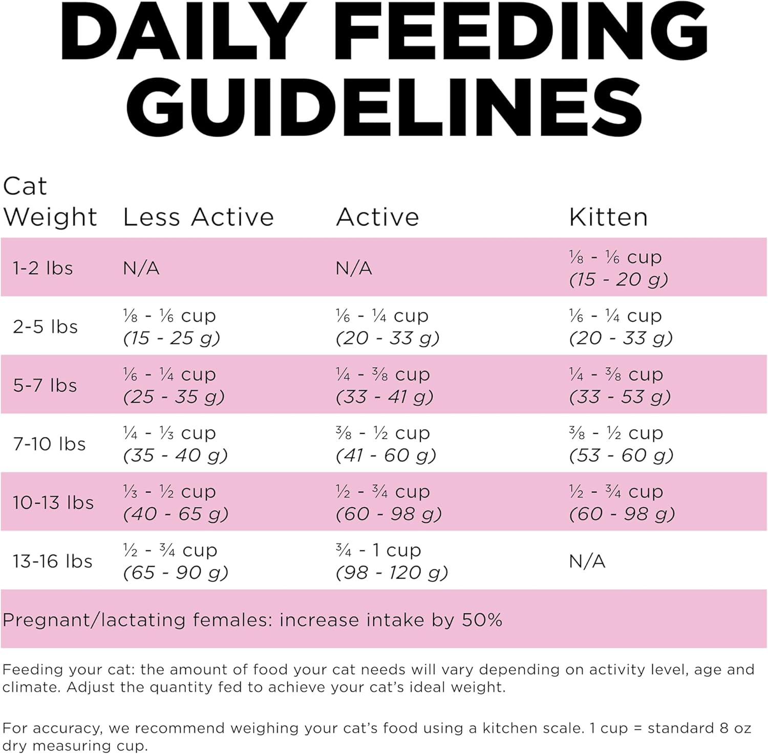 - Directions: The amount of food your cat needs will vary depending on breed, activity level, age and climate. Use our feeding chart as a guide, adjusting the quantity fed to achieve your cat's ideal weight.
