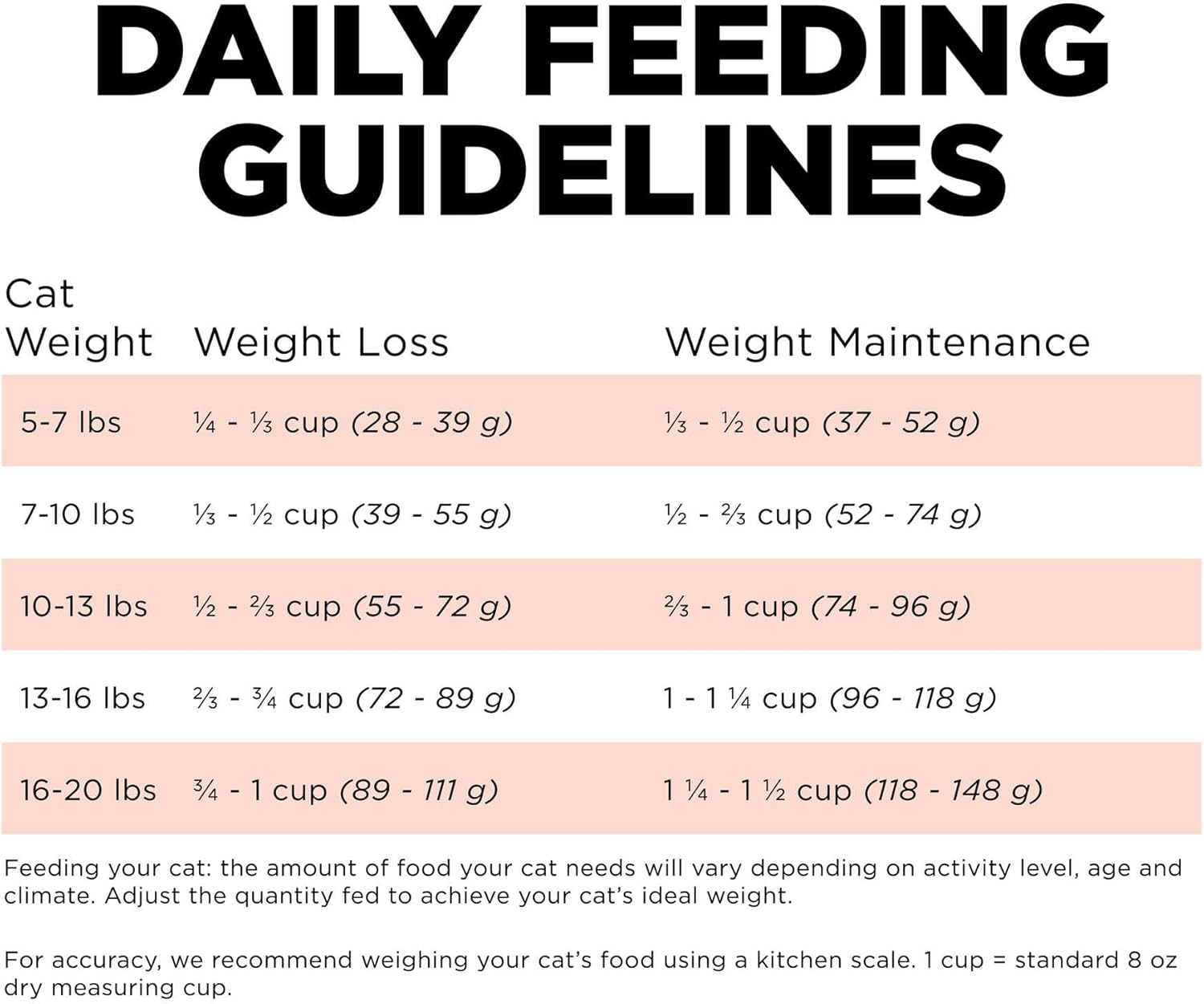 - Directions: The amount of food your cat needs will vary depending on breed, activity level, age and climate. Use our feeding chart as a guide, adjusting the quantity fed to achieve your cat's ideal weight.