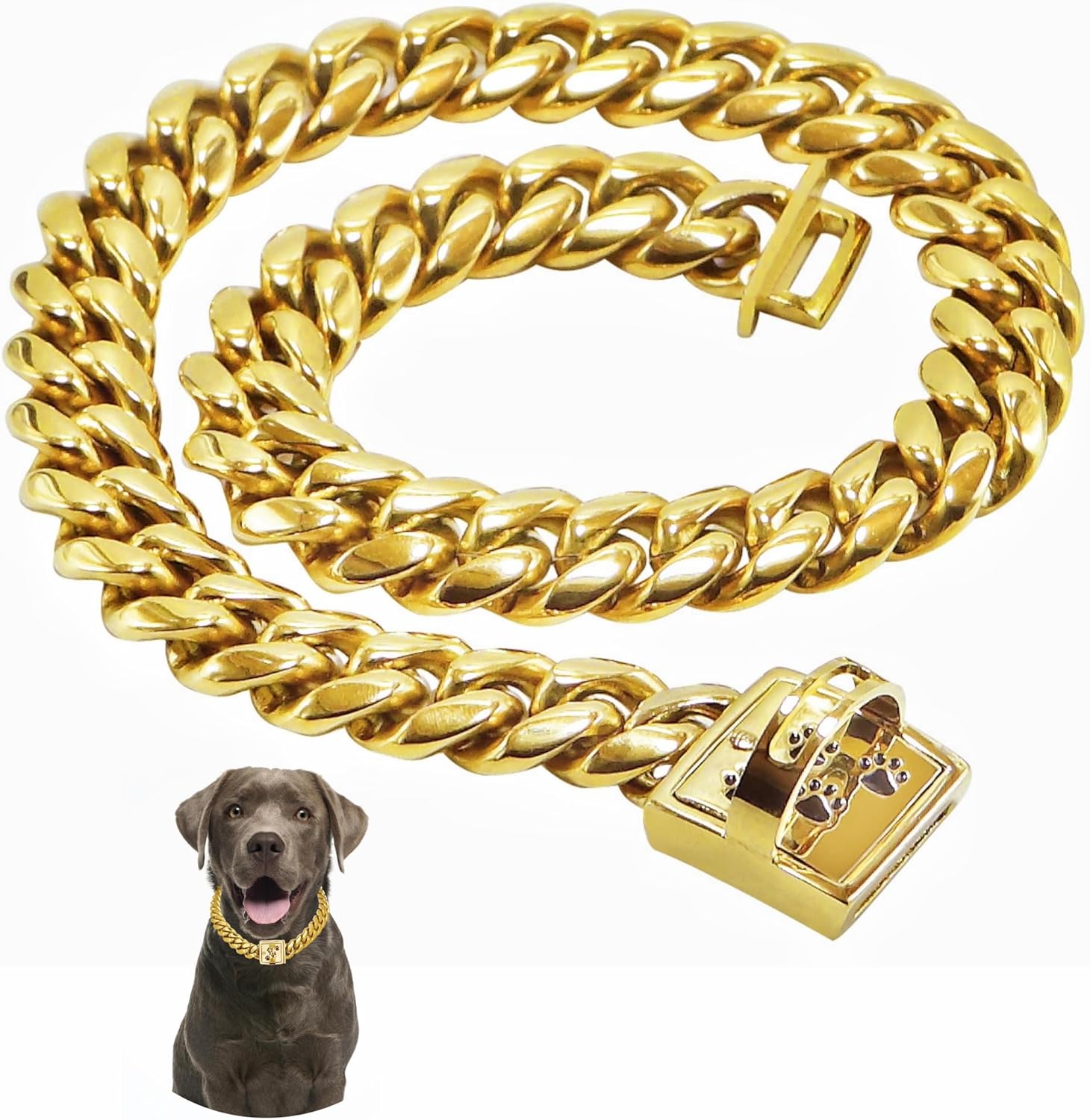 About this item 【Strong and Durable】This dog chain collar is a reliable and durable accessory designed to provide utmost security and control during walking and training . Made from heavy-duty stainless steel, strong and sturdy.This collar ensures long-lasting performance even for the most active dogs. 【Fashion Cuban Chain and Design Buckle】Featuring a stylish silver or gold Cuban link chain design, this collar not only does it serve its purpose of ruggedness but also adds a touch of style and elegance to your furry friend's appearance.The secure buckle guarantees that the collar stays in place,easy to open and lock, without any risk of accidental release,giving you peace of mind while walking your dog. 【More Size Options】This dog chain collar also offers convenience in terms of size choice. With a thickness of 15mm(0.59inches) and lengths ranging from 12 inches to 24 inches, the chain comes in a complete range of sizes to suit dogs of all sizes. Depending on the size of the dog, you can choose the perfect collar that fits your dog's neck size. This allows for a comfortable fit without restricting their movement or causing any irritation. Let the dog move more comfortably and freely. 【Chew-Proof, Non-Fading】This stainless steel chain collar is waterproof and does not rust or fade,also this collar is its chew-proof construction. It is specifically designed to withstand chewing and biting, making it suitable for puppies who are still teething or larger dogs with strong jaws. This feature ensures that the collar remains intact even during rough play or when left unattended. Suitable for both puppy and medium/large-sized dogs. 【Safe and Comfortable】The Dog Chain Collar for Dogs offers durability, style, security with its heavy-duty stainless steel construction and secure buckle design. Whether you're taking your pup out for a walk or engaging in training exercises together, this collar proves to be an essential accessory that enhances control over your furry companion while ensuring their safety at all times. › See more product details