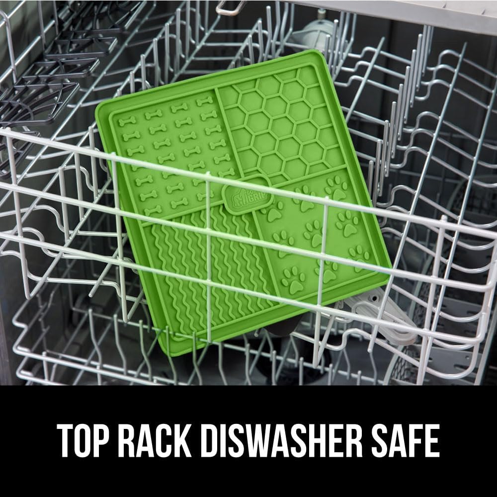 About this item FOUR UNIQUE PATTERNS TO ENGAGE AND DISTRACT PETS: keep pets entertained while they snack; mat is divided into four quadrants, each with uniquely designed patterns that help keep pets engaged; patterns add a fun texture while also capturing treats deep within their grooves for long snacking USE WITH PEANUT BUTTER, YOGURT, FOOD AND MORE: perfect for peanut butter, yogurt, wet food, kibble, and more; food grasps firmly to the mat’s raised textures and inside the deep grooves; use included spatula to spread your pet’s favorite soft treats onto the mat ULTRA STRONG GRIP WITH OVERSIZED MIDDLE SUCTION CUP: 49 suction cups on the back of the mat help keep mat secure on many surfaces; our mat also features an oversized suction cup in the middle for a mess free application and added grip; sticks to tile, stainless-steel, glass and more USE FOR GROOMING, BATHING AND NAIL TRIMMING: no more wiggling pets; keep your pet distracted during bath time, grooming, and nail trimming as mat easily sticks to most wall tiles DISHWASHER AND FREEZER SAFE, BPA FREE SILICONE: constructed with third party tested food grade silicone; mat can be placed in the freezer to elongate lick time; dishwasher safe on the top rack for an easy clean; mat measures 8 inches x 8 inches › See more product details