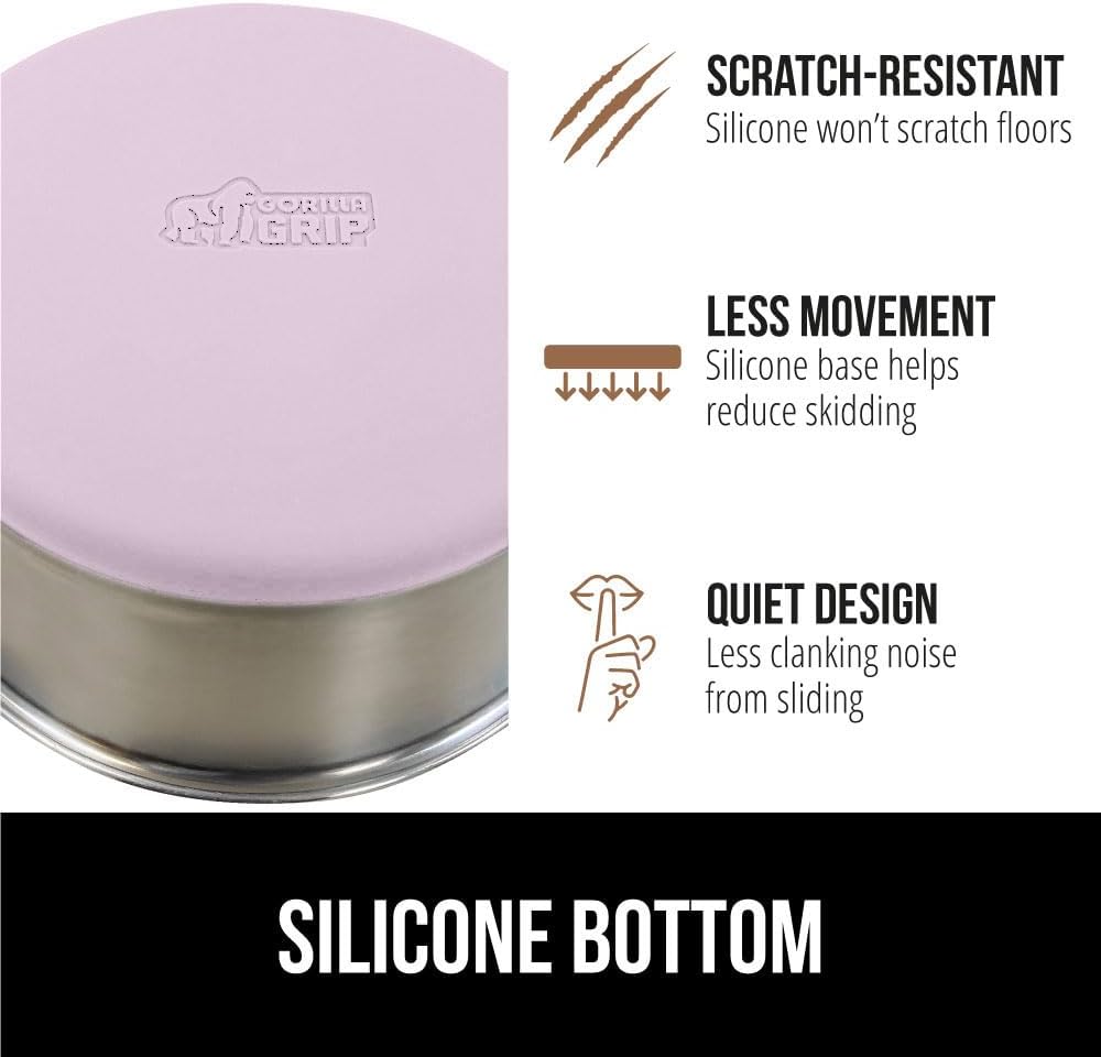 About this item HEAVY DUTY STAINLESS STEEL: constructed from durable, rust and dent resistant stainless steel for long lasting use; heat resistant and perfect for serving both warm and cold foods; plus, the silicone on the bottom is naturally waterproof and stain resistant, so your bowl will stay looking great, use after use FOOD GRADE AND BPA FREE: constructed from rust resistant, food grade stainless steel, this bowl is perfect for your pet; stainless steel is nonporous and longer lasting than plastic; bowl is FDA compliant and tested to comply with US regulations; dishwasher safe SILICONE BOTTOM: the Gorilla Grip bowl is constructed from durable silicone that helps keep the bowl steady and won’t scratch your floors; while some over eager eaters may still be able to slide the bowls, the silicone will help prevent much movement; plus, it reduces the noise from clanking and sliding across wood, tile, and more SET OF TWO FOR FOOD AND WATER: the bowls come in a set of two that are perfect for serving your pet both food and water; bowls accommodate all types of food including wet food, fresh food, dry food, and even the occasional bite of their human's dinner EXTRA SMALL 2 CUP SIZE: bowls come in 5 different sizes to suit all breeds; this extra small 2 cup measures 2.2 inches by 5.1 inches; perfect for small animals, kittens, cats, puppies, dogs, and Dachshund, Shih Tzus, Chihuahua, Yorkshire Terrier, Pekinese, Jack Russel Terrier, Maltese breeds › See more product details