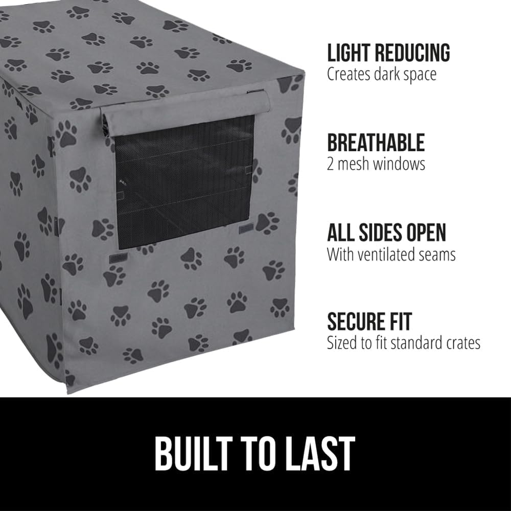 DURABLE, LIGHT REDUCING DESIGN: create a dark space for your pet to den; light reducing design helps eliminate outside distractions for anxious pets; stain and tear resistant fabric with thick reinforced stitching for long lasting use BREATHABLE CONSTRUCTION: adjustable closures at the cover's seam for added ventilation; mesh window at front and back of crate cover can be opened or closed for added visibility OPENS AT ALL SIDES: cover features side flaps that roll up and tie at all sides to accommodate crates with 1, 2, or 3 door openings STAYS IN PLACE: hook and loop fasteners at seams close crate cover; additional hook at loop fastener at the bottom corners help secure cover to crate; cover sizing aligns with standard size crates MACHINE WASHABLE, COMPATIBLE WITH MIDWEST HOMES FOR PETS, AMAZONBASICS, BESTPET: crate cover measures 42 inches x 28 inches x 30 inches so securely fit a standard 42 inch crate; available in many sizes to fit all size crates; machine washable; crate not included; indoor use only › See more product details