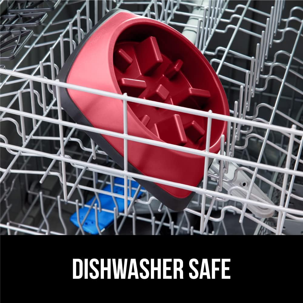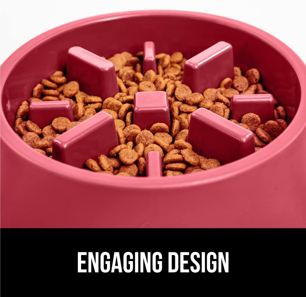 About this item DESIGNED TO SLOW DOWN EATING: the unique maze design inside the bowl effectively works to slow down the rate at which pets consumes their food, without discouraging them from eating; slower eating can help prevent bloating, discomfort, and improve your pet’s overall digestion ENGAGING DESIGN: custom design requires pets to navigate the built in features and obstacles to help keep your pet engaged in mealtime; pro tip, freeze treats in the bowl to create a fun puzzle for your pet to solve RUBBER BOTTOM: the slow feeder bowl’s nonslip, scratch resistant, rubber bottom curves around the entire base of the bowl, helping to keep it in place on your floors; eager eaters may slightly move bowl while eating, pair with the Gorilla Grip Pet Feeding Mat ALL FOOD TYPES: no matter what food your pet’s diet consists of, the bowl will work to help slow down their eating; the bowl can be used with wet food, dry food, fresh food, and even water or ice; no matter what type of food you use, the bowl is dishwasher safe for an easy clean; bowl is made from safe food grade materials A BOWL FOR ANY BREED: feed your pet the perfect portion every time; the slow feeder bowl comes in 4 convenient sizes; 1 cup, 2 cups, and 4 cups, so you can find the best capacity bowl for your pet; 2 cup capacity bowl measures 8.5in x 8.5in x 1.8in; consult with a vet or pet food producer to determine the ideal amount of food for your pet › See more product details