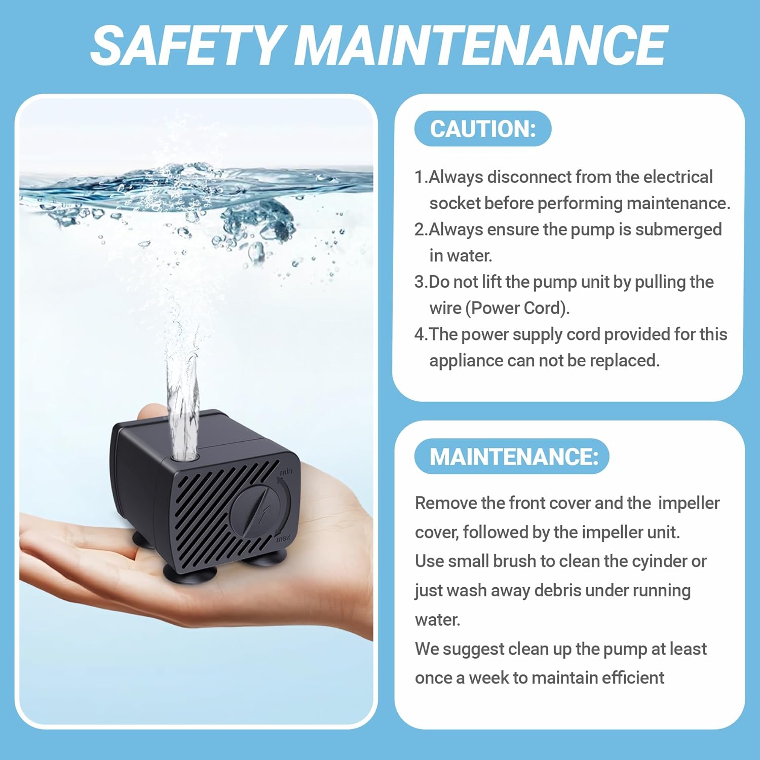 About this item The mini size makes the pump easy to hide or disguise in the water. Dimensions: 1.81''x 1.61''x1.18''. DC:5W, Maximum Flow: 79GPH (300L/H),AC:220-240V. The pump equip with an adjustable knob to adjust the water flow rate, the maximum flow: 79GPH (300L/H).With relible and duarable motor does not produce much noise, giving you quiet environment. This submersible pump is designed for small size terrarium,aquarium, fish tank, Pond, desk fountains, pet water fountain, water gardens and hydroponic systems. This submersible water pump is designed to sink in water, water inlet must be completely submerged in water. With 4 Strong suction cups at bottom, you can install the pump to spray water horizontally or vertically. Remove the front cover and the impeller cover, followed by the impeller unit. Use small brush to clean the cyinder and wash away debris under running every week. Water pump is mainly to provide oxygen and shower joy. It can not filter water thoroughly. You still need to change water 1-2 times per week to make a cozier home for your pet. › See more product details