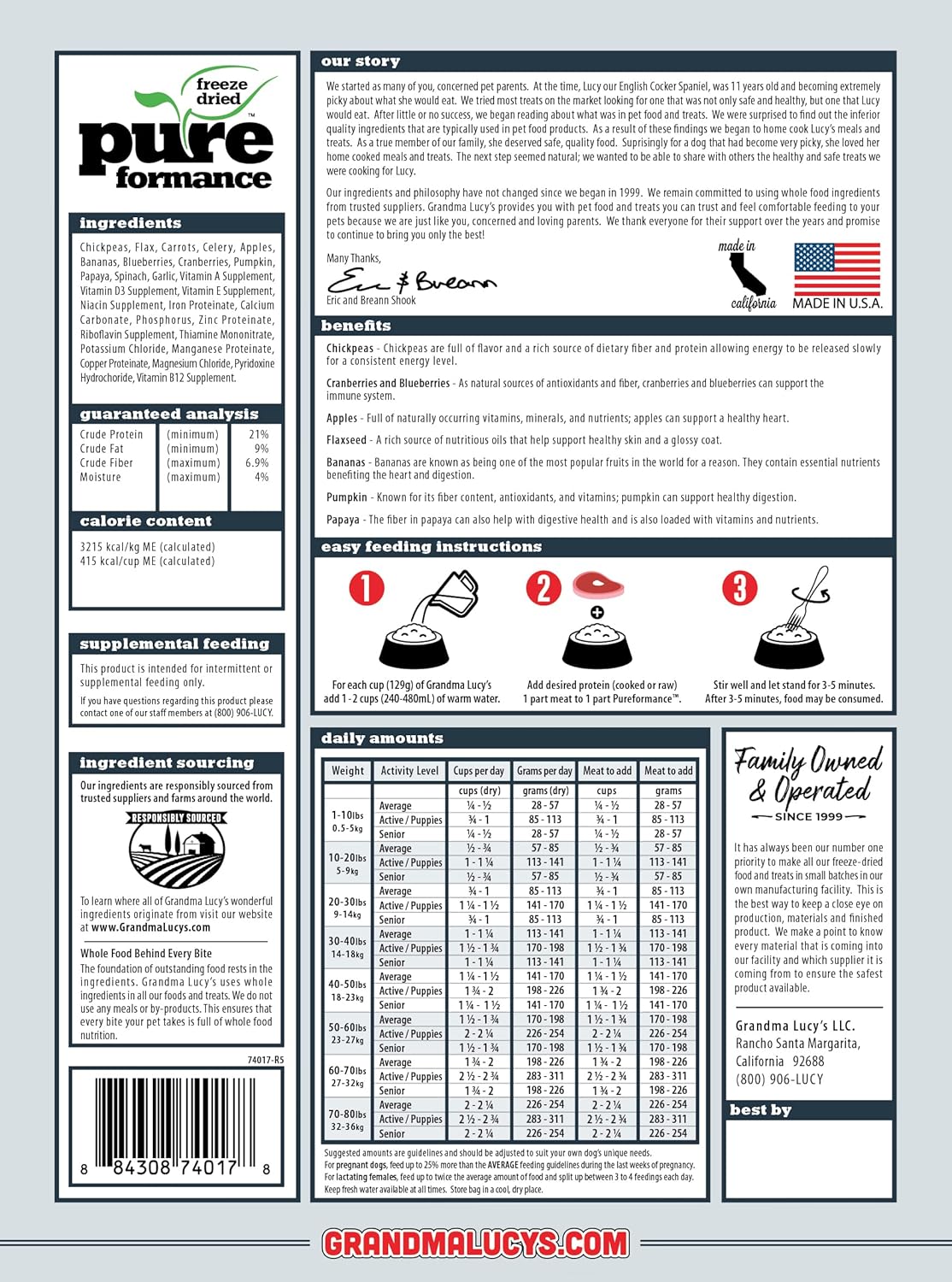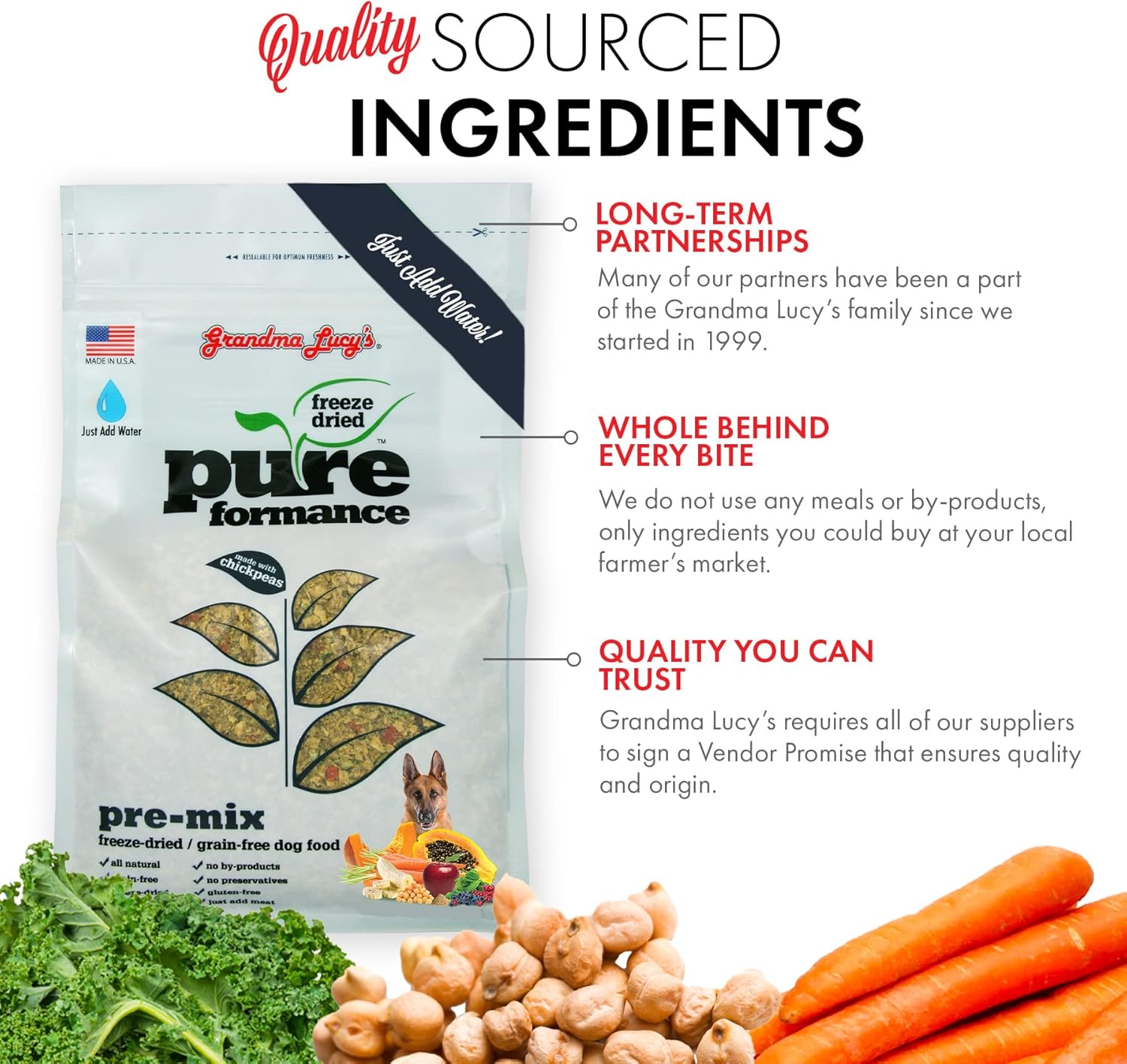 - Model Name: Grandma Lucy’s® Pureformance™ Freeze Dried Grain Free Pre-Mix Recipe Dog Food 8 Lbs