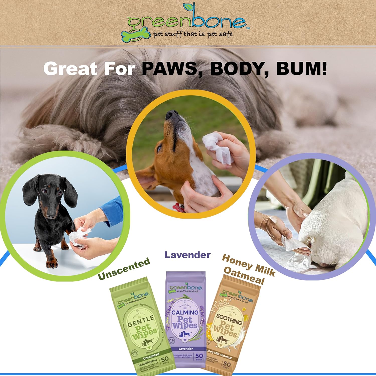 - Model Name: Greenbone On-the-Go Pet Wipes Bundle Pack - 150 Total Wipes (50 Each of Unscented, Lavender, Honey Milk Oatmeal) - Gentle Cleaning for Dogs and Cats