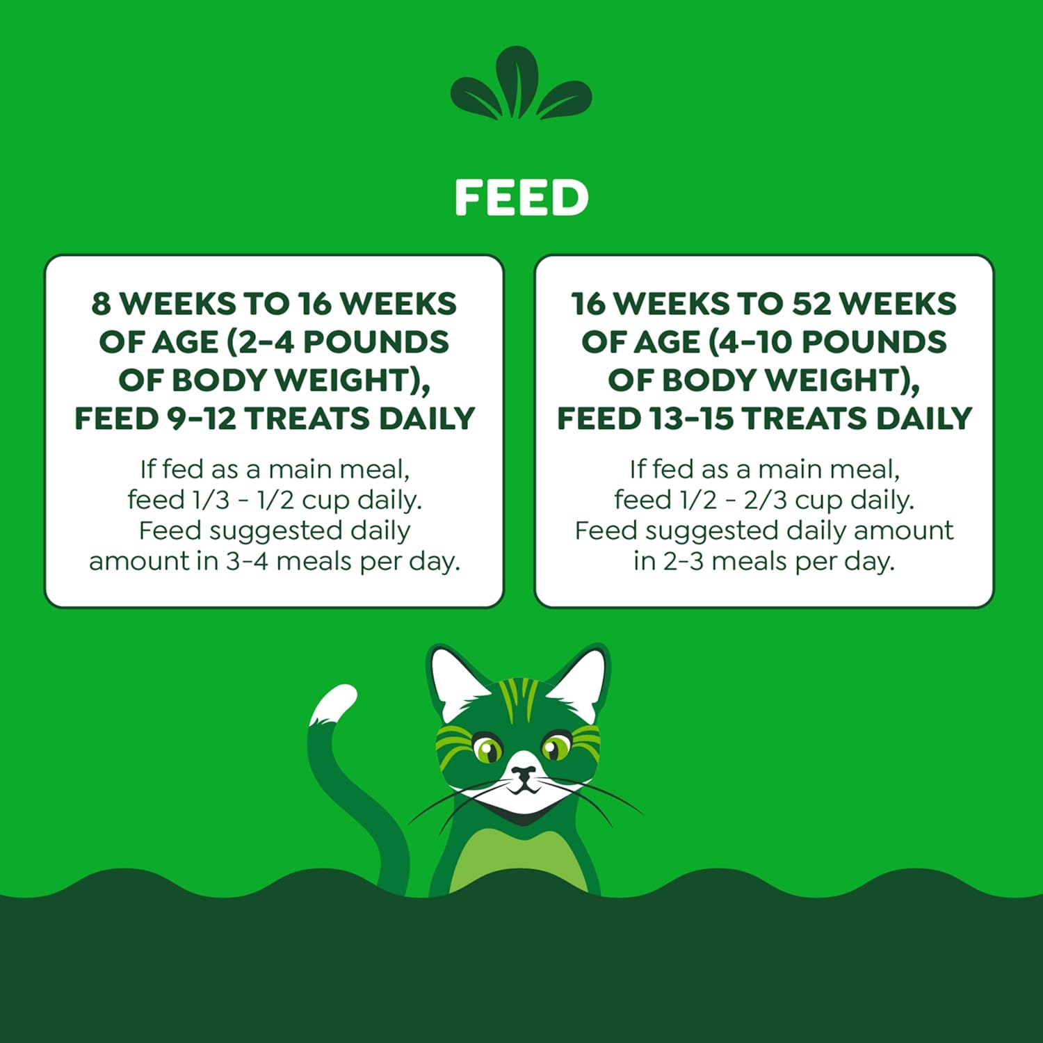 - Directions: FEEDING INSTRUCTIONS For Kitten 8 weeks to 16 weeks of age (2-4 pounds of body weight), feed 9- 12 treats daily. If fed as a main meal, feed 1/3 - 1/2 cup daily. Feed suggested daily amount in 3-4 meals per day. Provide fresh drinking water at all times. For Kitten 16 weeks to 52 weeks of age (4-10 pounds of body weight), feed 13- 15 treats daily. If fed as a main meal, feed 1/2 - 2/3 cup daily. Feed suggested daily amount in 2-3 meals per day. Provide fresh drinking water at all times. To help maintain freshness, we recommend closing the lid tightly and storing in a cool, dry location.