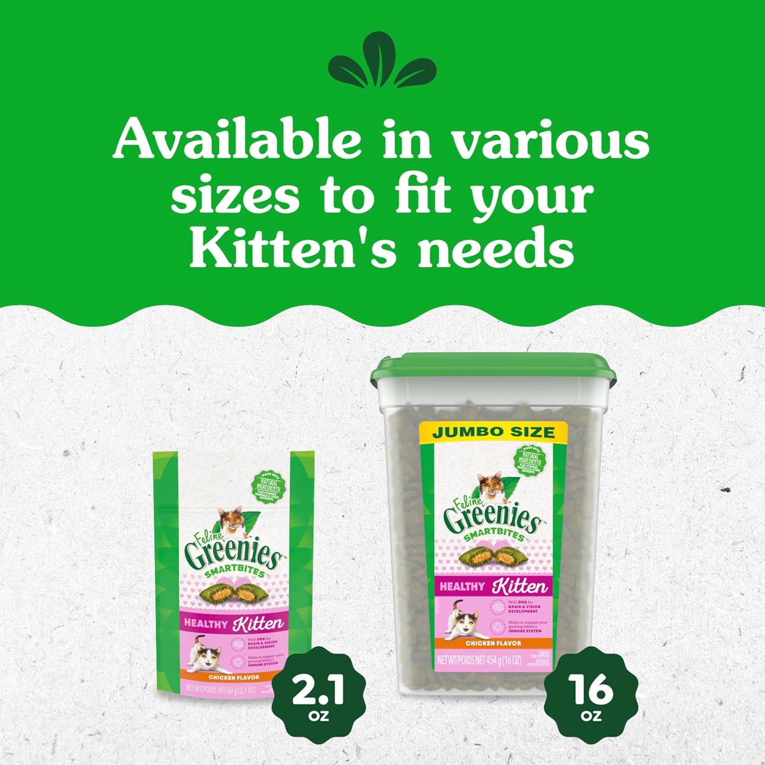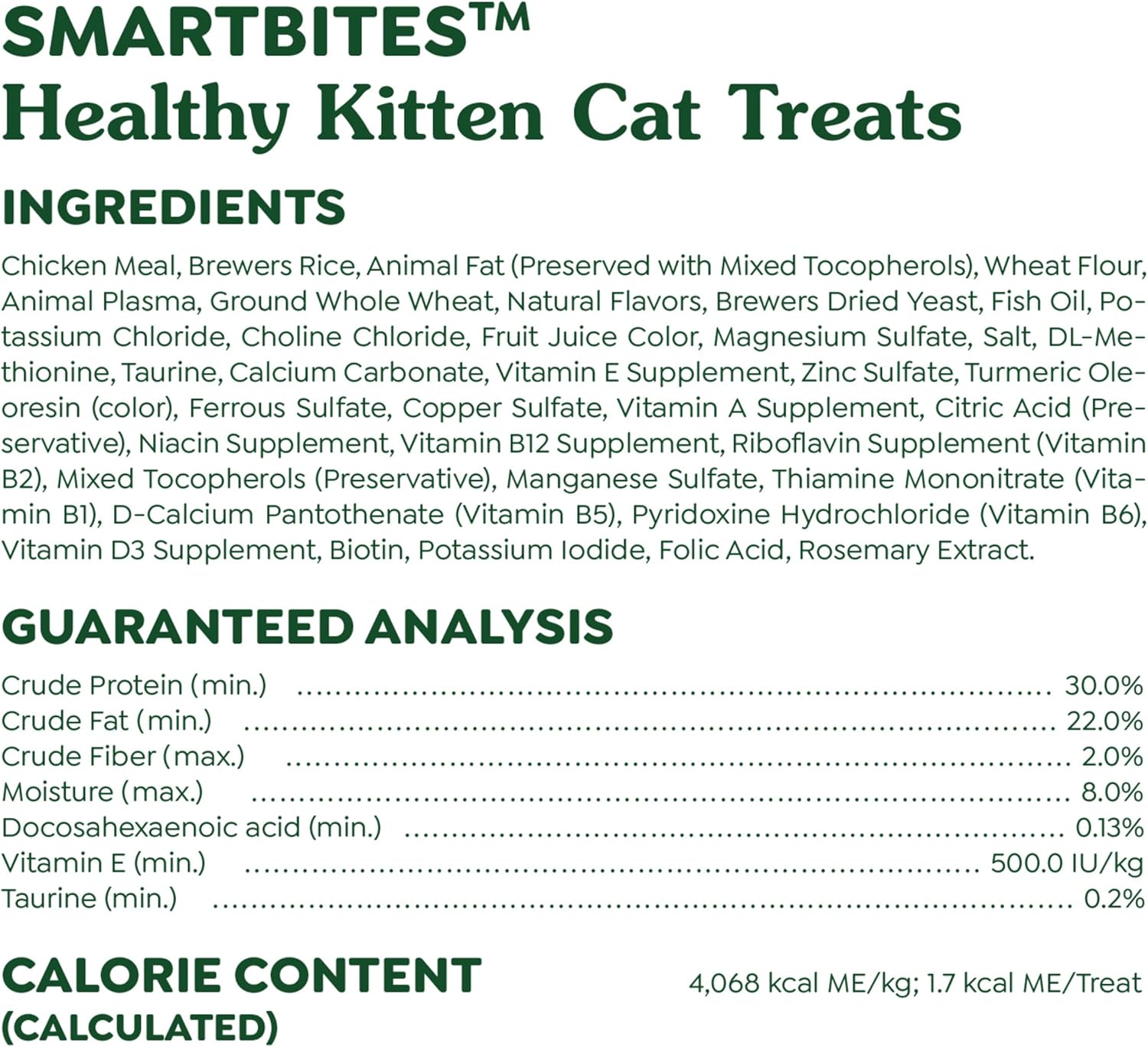 Made for growing kittens, FELINE GREENIES SMARTBITES Healthy Kitten Treats in a delicious chicken flavor are a healthy snack kittens will love. Soft on the inside and crunchy on the outside, these dual texture treats are made with DHA for brain and vision development and are formulated to support the needs of a growing kitten. With less than 2 calories per treat, these bite-sized snacks are great for kitten training or daily treating. Made with natural ingredients and no artificial flavors, preservatives or fillers, FELINE GREENIES SMARTBITES are the nutritious daily treat your feline friend deserves. Trace amounts of preservatives may be present due to potential cross-contact during manufacturing.