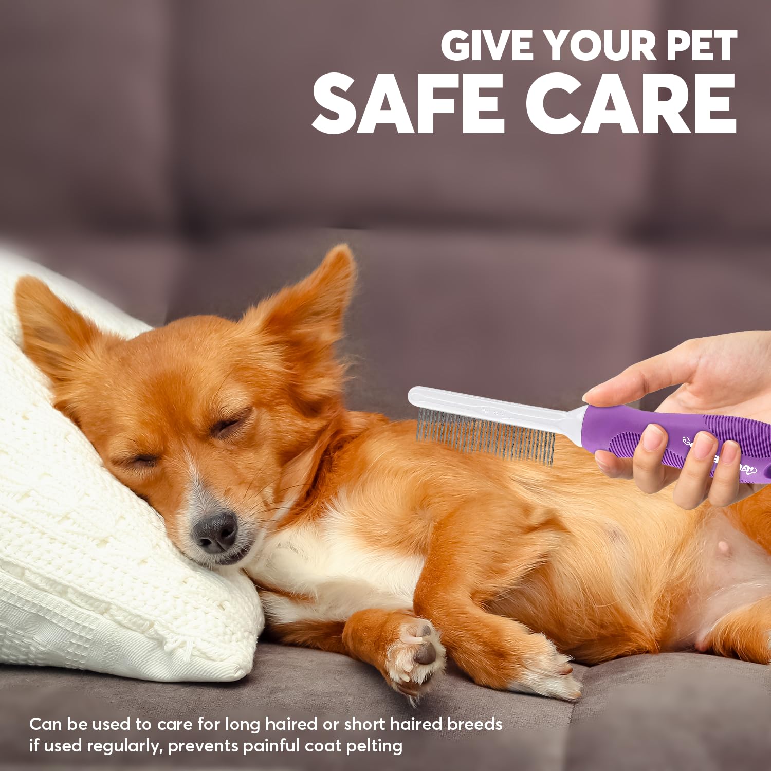 About this item SPECIALIZED DOG GROOMING COMB expertly crafted with both long and short metal teeth to brush your pet's top coat and undercoat simultaneously. The Long pins eff ectively tackle tangles & straighten fur, while shorter pins remove & condition undercoat! PERFECT FOR SHORT TO LONG-HAIRED BREEDS: Unlike typical cat and dog detangling combs, this dog comb for matted hair is most eff ective on short thick coats or long, moderately thick coats. It's ideal for breeds Pomeranians, Poodles, Persian cats, etc. GENTLE & SAFE ON SKIN: Engineered specifi cally to swiftly and painlessly detangle matted hair and eliminate bothersome knots. The rounded teeth provide a comfortable and safe massage for your pet's skin, enhancing blood circulation for a glossy coat! ANTI-SLIP HANDLE GRIP: Our Detangling brush features a high-quality, nicely rubberized handle that prevents slipping. The comfortable grip, designed to fi t in the palm with a sturdy and controllable feel, makes grooming easier and pain-free. › See more product details