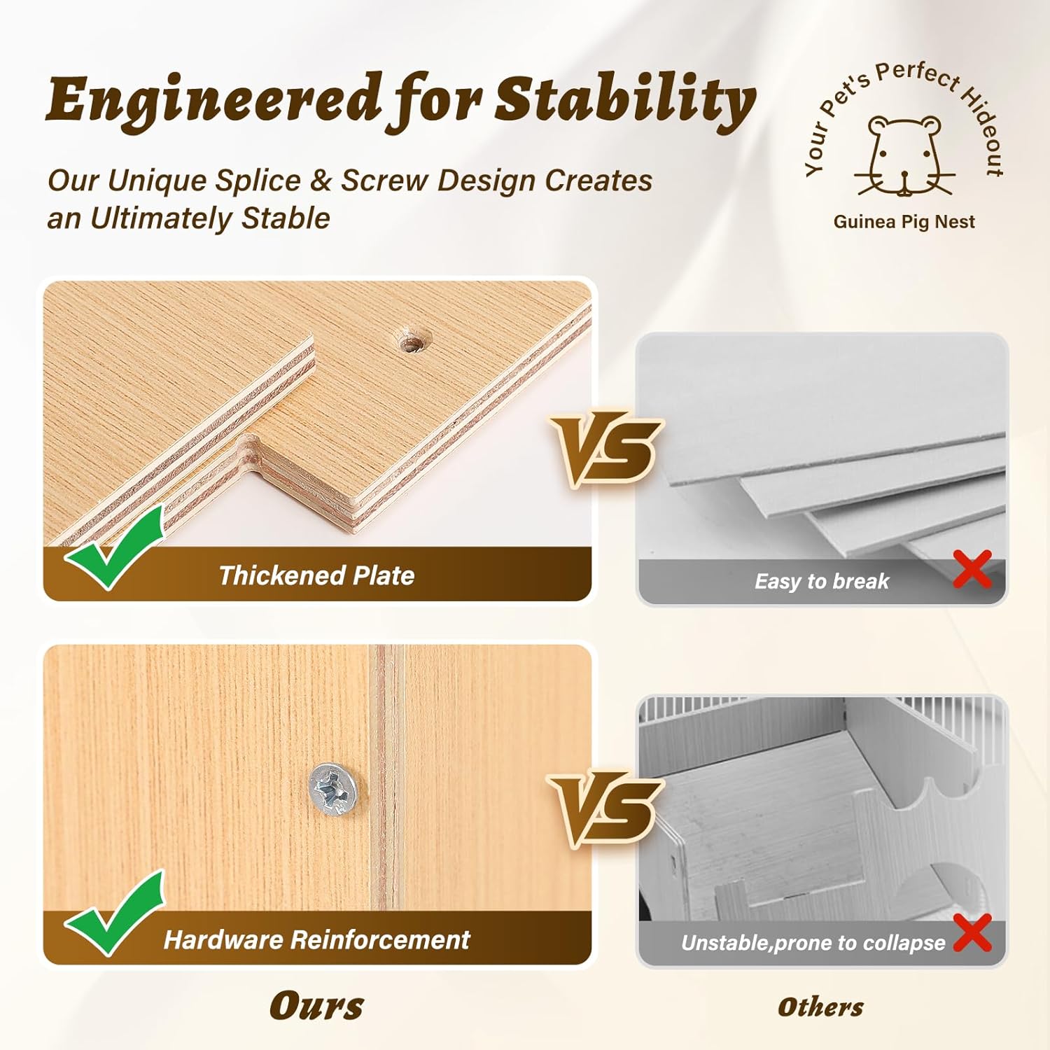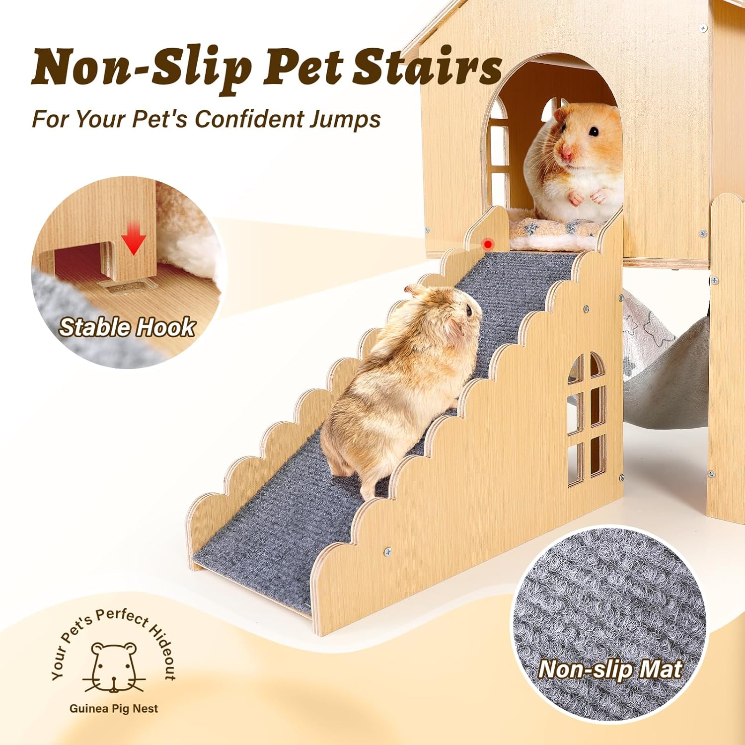 About this item Multifunctional Guinea Pig Hideout:This all-in-one guinea pig hideout combines a hammock, platform, hideaway house, and climbing ramp—perfect for resting, playing, and exploring. It's one of the most versatile guinea pig toys and guinea pig accessories that saves space in guinea pig cages while keeping your pets active and entertained. Safe & Cozy Guinea Pig House:Crafted from natural solid wood and soft plush mats, this guinea pig house is non-toxic, splinter-free, and safe for chewing. The removable mats and hammock are machine washable, making it one of the essential guinea pig supplies for maintaining a clean and healthy habitat inside your guinea pig cage. Easy Assembly for Guinea Pig Cage Accessories:Quickly set up this guinea pig hideout with its user-friendly mortise-and-tenon design and included screws. It’s easy to disassemble for cleaning—ideal for all small animal. Fits Most Guinea Pig Cages & Small Pets:Designed to fit most guinea pig cages, this spacious guinea pig hideout comfortably houses 2-4 guinea pigs, hamsters, or rabbits. It’s one of the top guinea pig cage accessories for pet owners looking for a reliable hamster hideout or bunny hideout. A Hideout That's Also Home Decor: Crafted with a charming wooden look and whimsical, ear-shaped details, this hideout is more than just guinea pig stuff—it's a piece of delightful home decor. The ultimate thoughtful gift and a must-have for any discerning pet parent. › See more product details