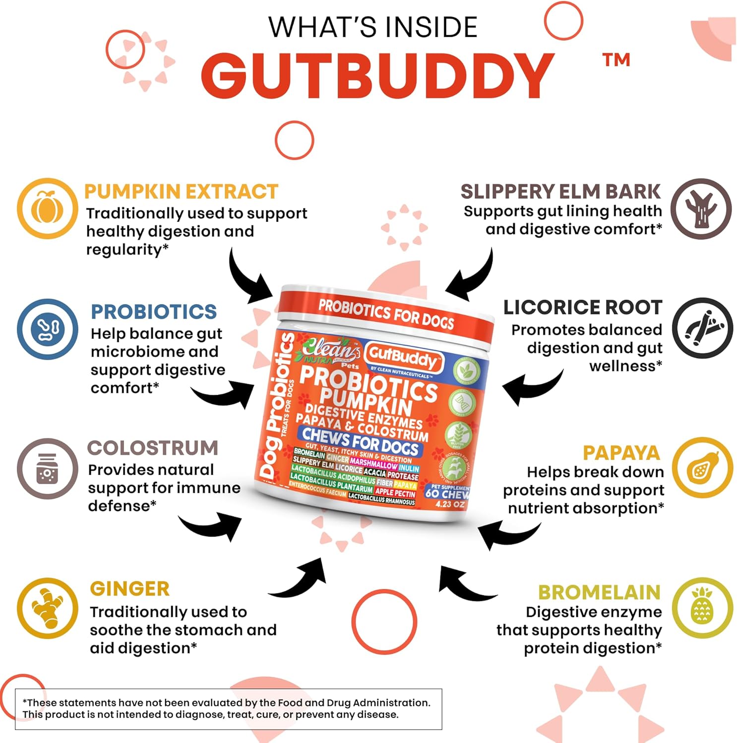 Clean Nutraceuticals turns tail wags into wellness with a tasty 60-chew blend of pumpkin and powerful dog probiotics that targets digestive health from the very first bite. Each soft chew delivers a veterinarian-inspired spectrum of enzymes for digestion plus prebiotic fiber, setting the ideal stage for the seven-strain probiotic complex. Powerful blend of probiotics, acidophilus probiotic, rhamnosus probiotics, lactobacillus plantarum, and enterococcus faecium as these beneficial flora work together to maintain a balanced gut flora probiotic. Additionally, our supplements for dogs includes colostrum capsules, known for its vital nutrients that supports probiotic activity. Unlike ordinary dog supplements, our formula layers pumpkin powder for dogs with papaya, protease, amylase, lipase enzymes, cellulase and bromelain to supply gut-soothing soluble fibers. The result is a true dog probiotic that supports smooth stools while providing dog probiotics for digestive health during food transitions or stressful travel. But digestion is only the beginning. colostrum teams with slippery elm bark to coat the gastrointestinal lining, while licorice root powder, dog pumpkin powder, marshmallow root powder further calm delicate tissues, creating the best itchy skin relief for dogs. For pets needing dog probiotics for yeast, itchy skin and itchy ears, the blend of prebiotics and probiotics plus acacia fiber works from the inside out to offer gentle itch relief for dogs. Give your four-legged family the comfort they deserve with our dog probiotics, and watch tails wag in gratitude.