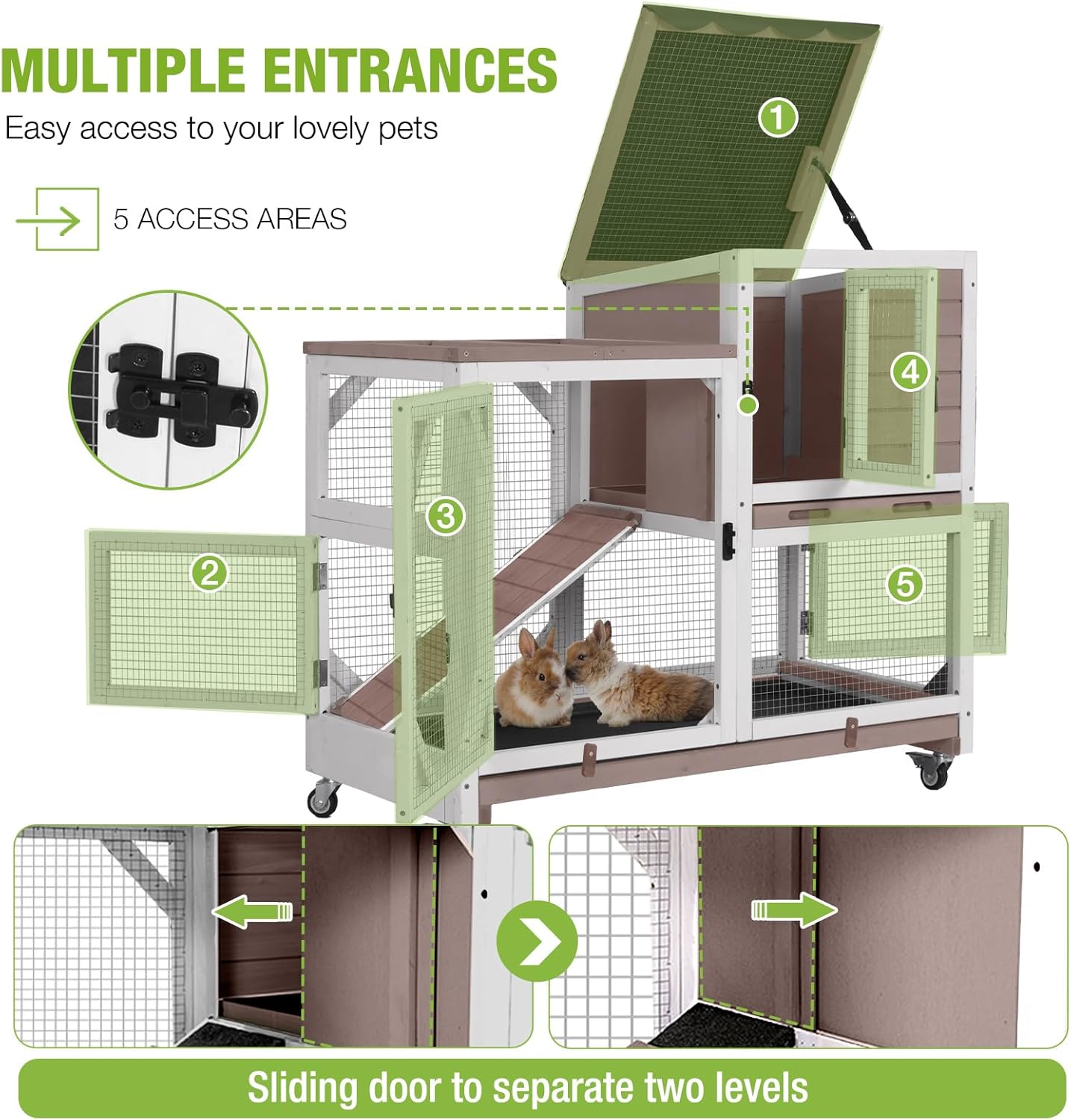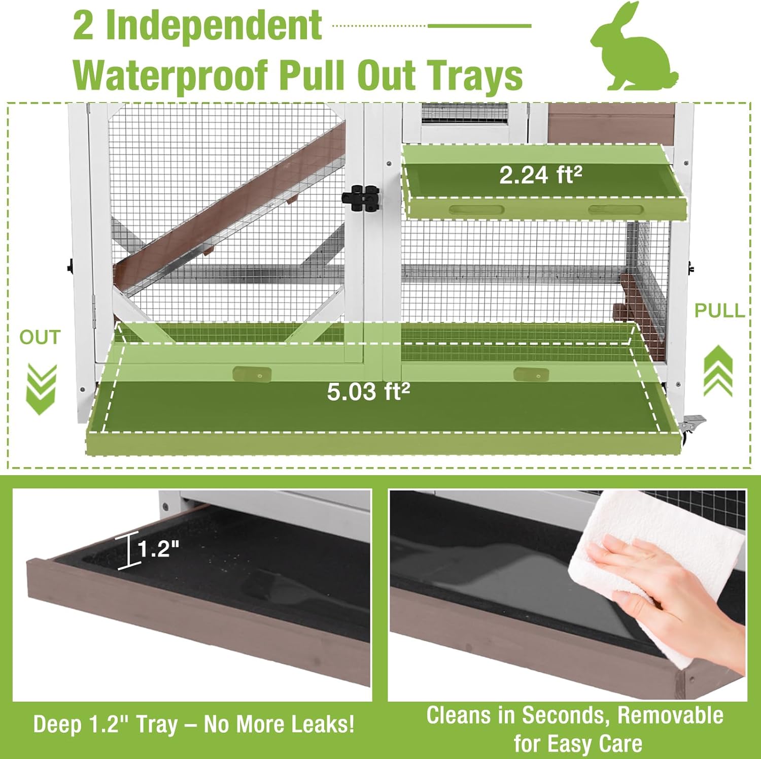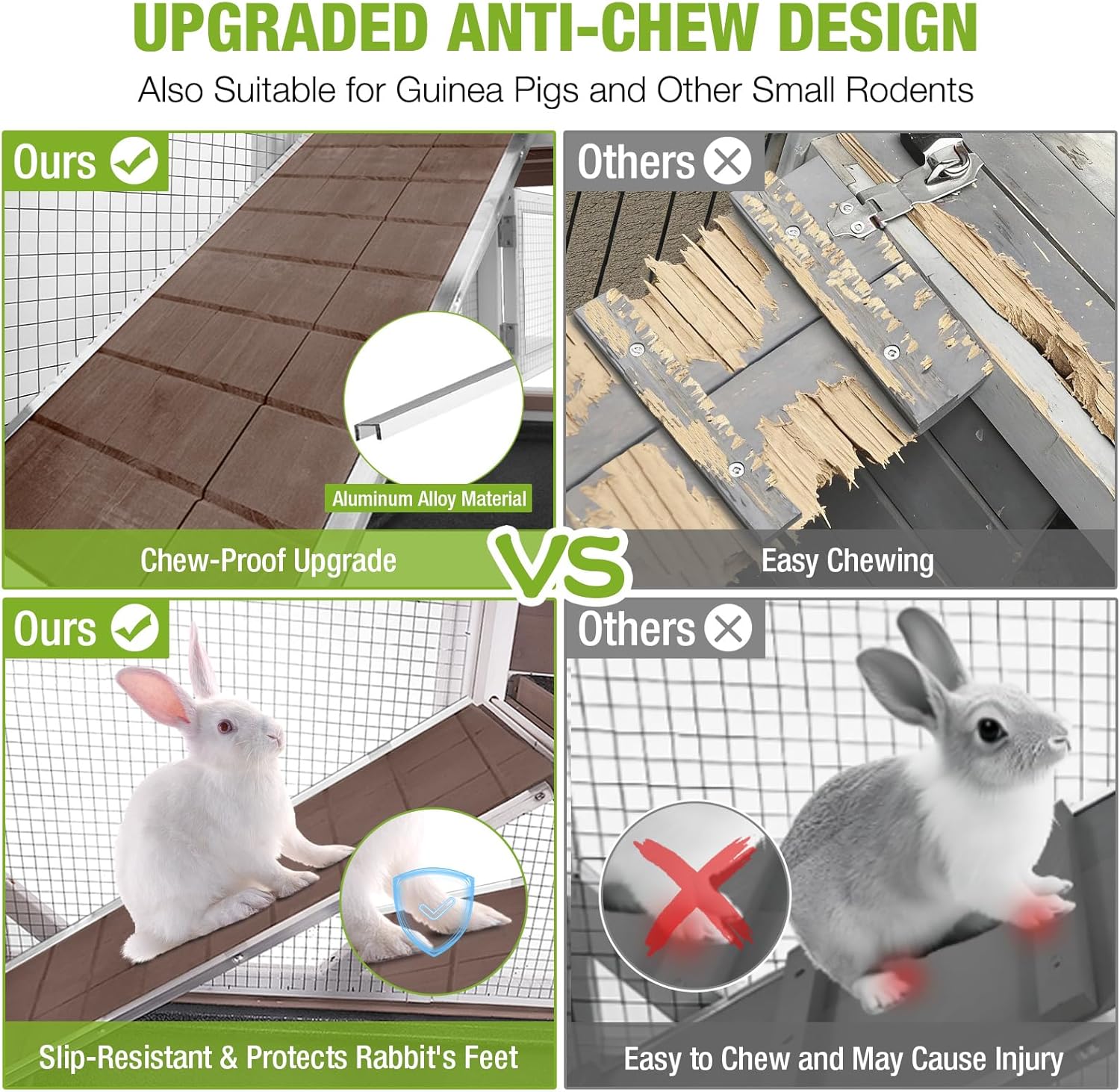 About this item Leak-Proof Locking Trays: 2 deep, removable trays with secure locks stay put even when pets jump or scamper—no messy spills, easy cleanup, and a dry, odor-free habitat for your furry friends Chew-Resistant Metal-Guarded Ramp: Dual full-length metal edges stop relentless gnawing (perfect for chewer bunnies/guinea pigs)! The textured, splinter-free surface protects delicate footpads while delivering unshakable traction—twice as durable as flimsy wooden ramps Mobile & Stable with Brakes: 4 smooth-swiveling casters (2 with locks) let you glide the bunny hutch from living room to patio or backyard effortlessly. Lock the brakes for rock-solid stability—no accidental shifting, even with rambunctious pets 5 Easy-Access Doors: Reach every nook and cranny for quick cleaning, feeding, or snuggles—no need to disrupt your pet’s space! Simplifies waste removal, tray checks, and bonding time, keeping the cage fresh with minimal hassle Spacious 2-Story Rabbit Cage:Measuring 39.3"L x 22"W x 36.8"H, this large 2-story design offers ample room for bunnies, guinea pigs, or other small animals to hop, play, stretch, and relax Easy Assembly: All necessary parts are included, with pre-drilled holes for easy setup in under 30 minutes. The sturdy structure resists splitting or falling apart when assembled correctly › See more product details
