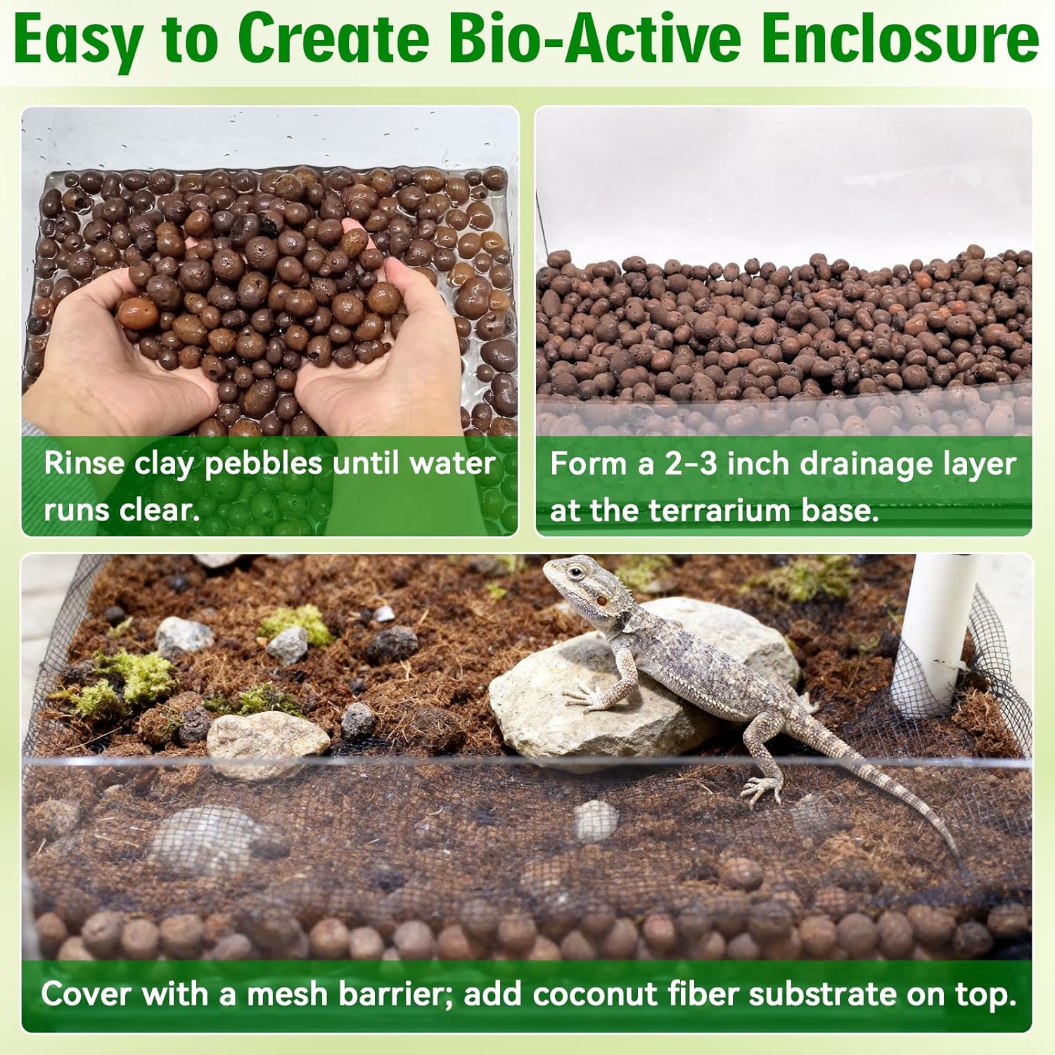 2 Quarts Expanded Clay Balls - Great Base Layer for Reptile TankSpecifications:Package includes: 2 quarts hydro ballsMaterial: clay Item Weight: 1.1LBFeatures:Our clay pebbles are made of 100% natural clay fired at high temperatures. The internal micro-pores efficiently channel excess water while creating pathways for air circulation.Easy to Clean.Low Dust and Odor-AbsorbingApplications:Suitable for Leopard, Gecko, Tortoise, Frog, Lizard and Ball Python; compatible with bio-active terrarium setups.