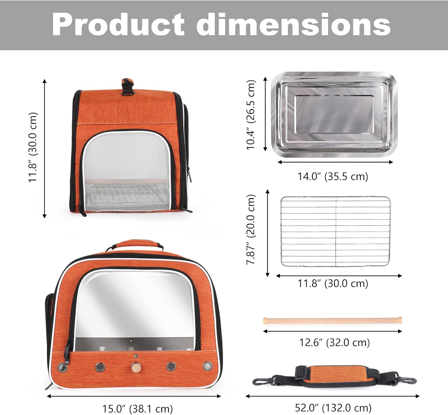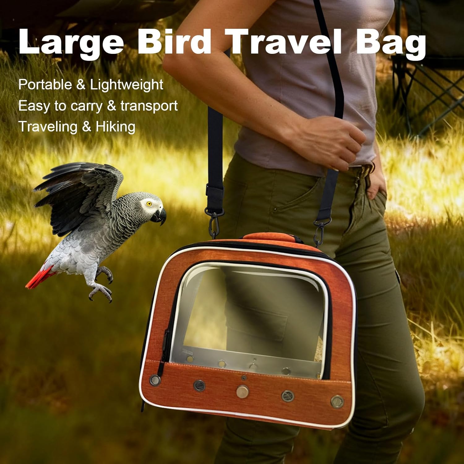 DUAL VISIBILITY: Features clear windows in both front and back panels allowing easy monitoring of your bird during transport. Two zipped access opening in front and side to invite parrot to get in & out easily and conveniently. VENTILATION SYSTEM: Equipped with 10 strategically placed vent holes to maintain proper airflow and comfort for your feather friends. The both sides are built with breathable mesh to feature convective airflow and breathability too. COMFORT FEATURES: Includes a wooden stand perch for natural grip and a metal tray for easy cleaning and maintenance, additional metal grid to place above the metal tray, so the bird can stand on metal grid but away from the feces tray. CONVENIENT ACCESS: Side zippered window provides quick access for feeding or interaction, with additional storage pockets for travel essentials on the opposite side. PORTABLE DESIGN: Durable carrier with a sturdy top handle makes transportation comfortable and secure for both owner and bird, sling shoulder strap with padded to secure the carrier well. Great fit for small to large size of birds like parrot, parakeet, budgies, cockatiel with long tail, conure, African grey etc. › See more product details