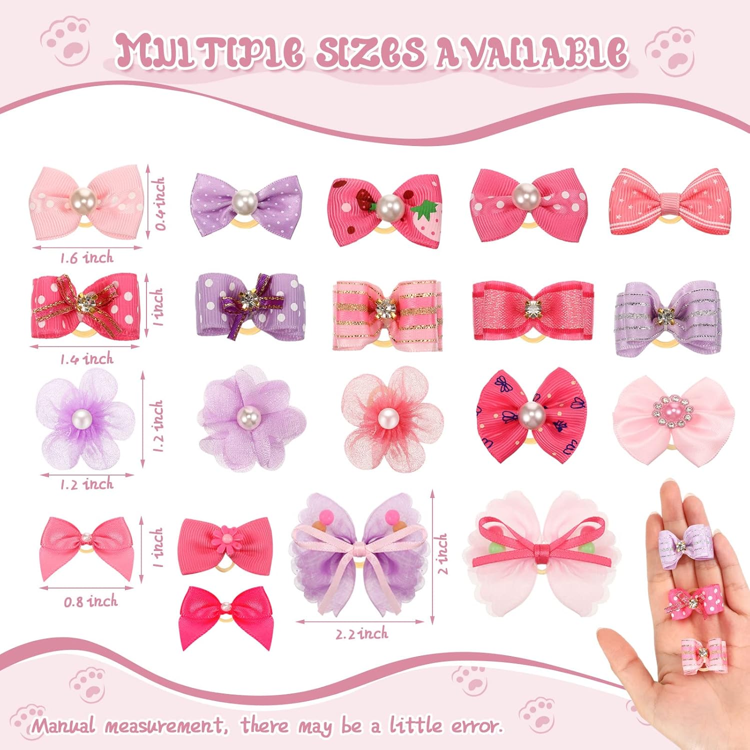 Cute Dog Bow Suit Set: the package comes with 20 pieces of dog hair bows in bow shape with various styles, suitable for small pets, medium and large dogs and other furry pets, enough quantities to allow you to dress up your pets Manual Measurement Size: the dog hair bows for small dogs measure about 1.77 x 1.18 inch, and the weight is about 1-2 g, small and lightweight to wear, which will not cause extra weight for your pets, allowing your pets to wear with comfort; Manual measurement, please allow for a 1-3 cm margin of error Cute and Adorable Design: our hair bows for dogs are mainly designed in pink, purple, and rose colors, bright and beautiful, which can be matched well with various kinds of clothes of your dogs or cats, giving them a stylish outlook Wide Applications: these dog hair bows with rubber bands are versatile for various occasions, such as your dog's birthday, Christmas activities, dog wedding, daily walking, and other holidays, which can make your pets more charming and beautiful, and you can also Safe for Your Pets: our pet dog hair bows are made of quality polyester fibre material with elastic rubber band, rhinestone and pearls, safe and odorless, reliable and reusable, skin friendly and safe, and not easy to deform or fade, which will not be harmful for your pet's skin, so you can rest assure to use it › See more product details