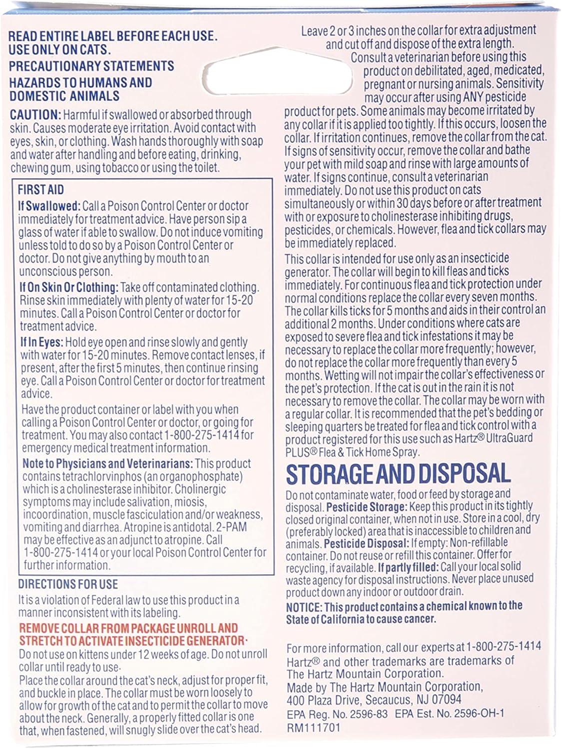 Tell pesky parasites to ‘bug off’ with the Hartz UltraGuard Flea & Tick Collar for Cats and Kittens. This fresh scented, purple collar kills and repels fleas and ticks for 7 months. The water resistant design remains effective even after getting caught in the rain. Also features a breakaway safety release. For continuous flea and tick protection from head to tail, replace the collar every 7 months. Directions: Remove collar from package, unroll and stretch to activate insecticide generator. Do not use on kittens under 12 weeks of age. Do not unroll collar until ready to use. Place the collar around the cat’s neck, adjust for proper fit and buckle in place. The collar must be worn loosely to allow for growth of the cat and to permit the collar to move about the neck. Generally, a properly fitted collar is one that, when fastened, will snugly slide over the cat’s head. Leave 2 or 3 inches on the collar for extra adjustment and cut off and dispose of the extra length. Consult a veterinarian before using this product on debilitated, aged or medicated pets. Sensitivity may occur after using any pesticide product for pets. Some animals may become irritated by the collar if it is applied too tightly. If this occurs, loosen the collar. If irritation continues, remove the collar and bathe your cat with mild soap and rinse with large amount of water. If signs continue, consult a veterinarian immediately. Do not use this product on cats simultaneously or within 30 days before or after treatment of other flea and tick products. However, flea and tick collars may be replaced immediately.