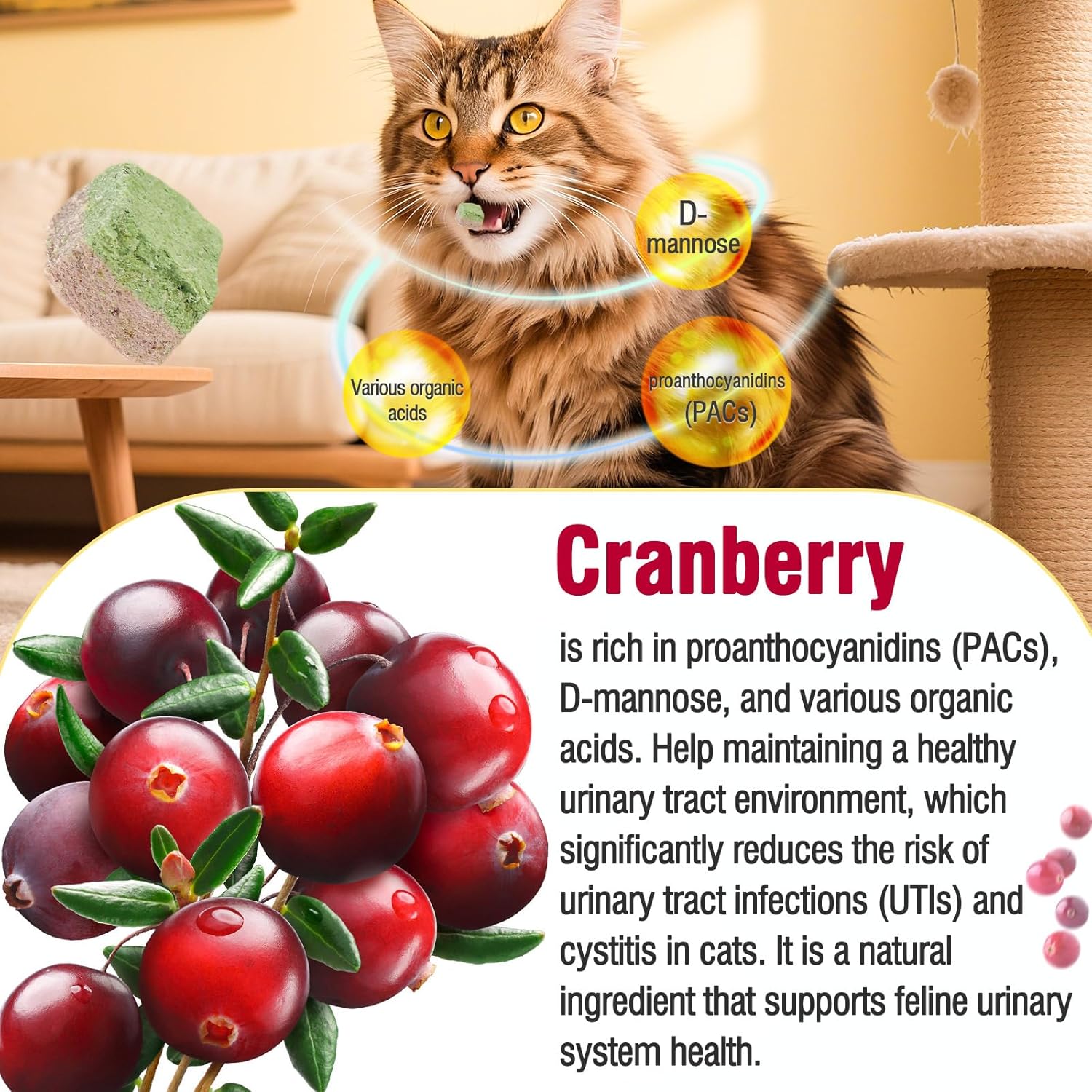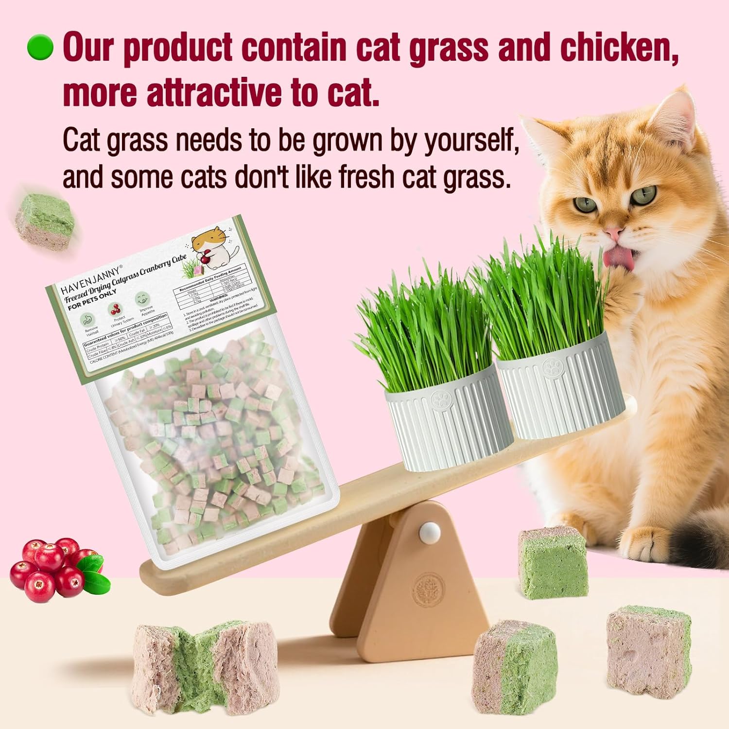 About this item Dual-Flavor Fun & Double Benefits: Treat your cat to twice the goodness with our unique Cranberry & Cat Grass Duo! This powerful combination delivers the hairball-relief benefits of cat grass alongside the urinary tract support of cranberry—all in one tasty, crunchy bite Urinary Tract Support: Enriched with cranberries, a natural source of proanthocyanidins (PACs), these cat treats help maintain a healthy urinary tract. We've blended in high-quality chicken, heart, and liver not only for added nutrition but also for superior palatability that satisfies your cat's natural carnivorous instincts Natural Hairball Relief: The natural fiber from cat grass aids healthy digestion and gently helps move hair through the intestinal tract, reducing vomiting and discomfort associated with hairballs Supports Oral Health: The crispy, porous texture of our freeze-dried treats acts like a gentle toothbrush, helping to scrub away plaque and tartar as your cat chews. This satisfying crunch also caters to their natural chewing urges, helping to protect your furniture from unwanted attention Pure, Nutrient-Rich Goodness: Made with a simple, trust-worthy recipe featuring real food ingredients. Our gentle freeze-drying process locks in peak nutrition and fresh flavor without any artificial preservatives, colors, or grains. Perfect as a daily supplement, training reward, or dental health snack. Please follow feeding guidelines to avoid overfeeding › See more product details