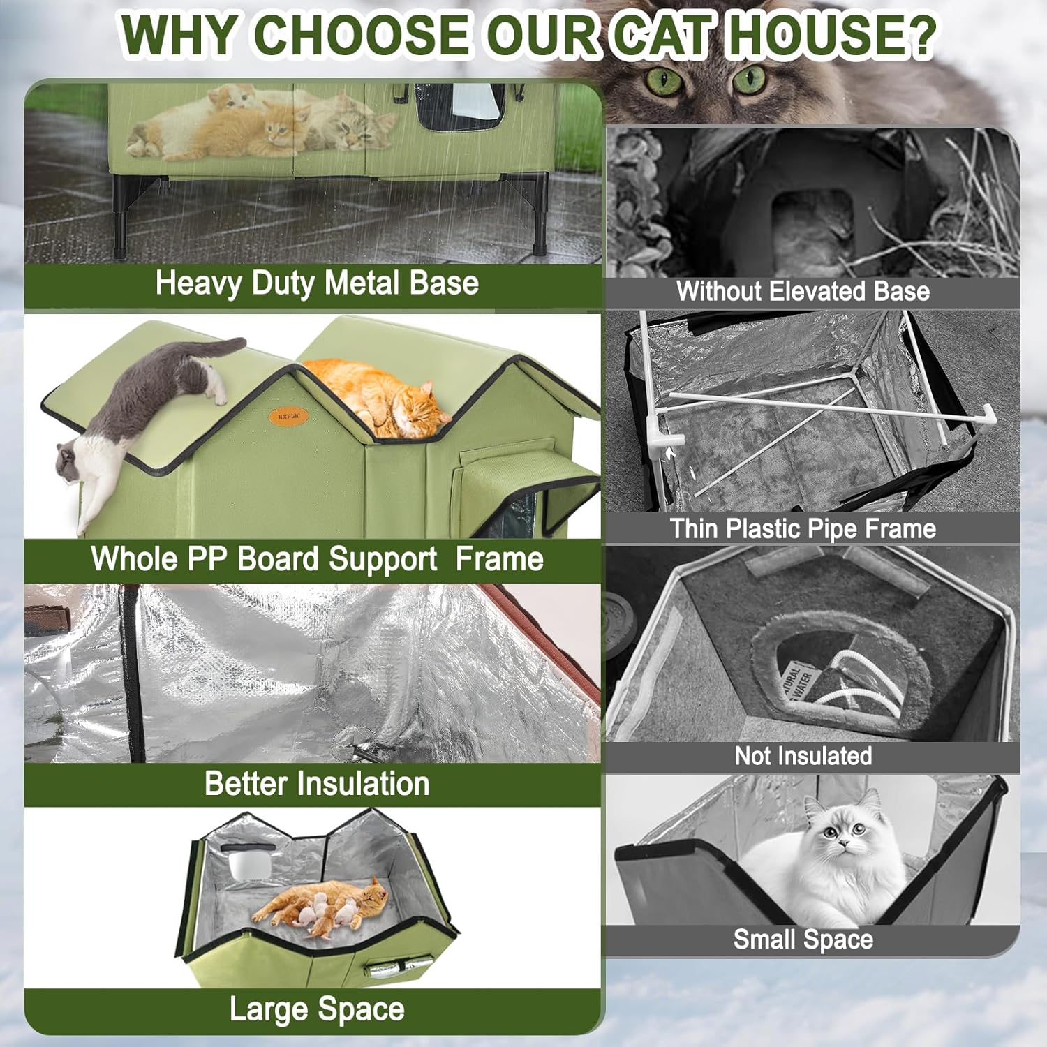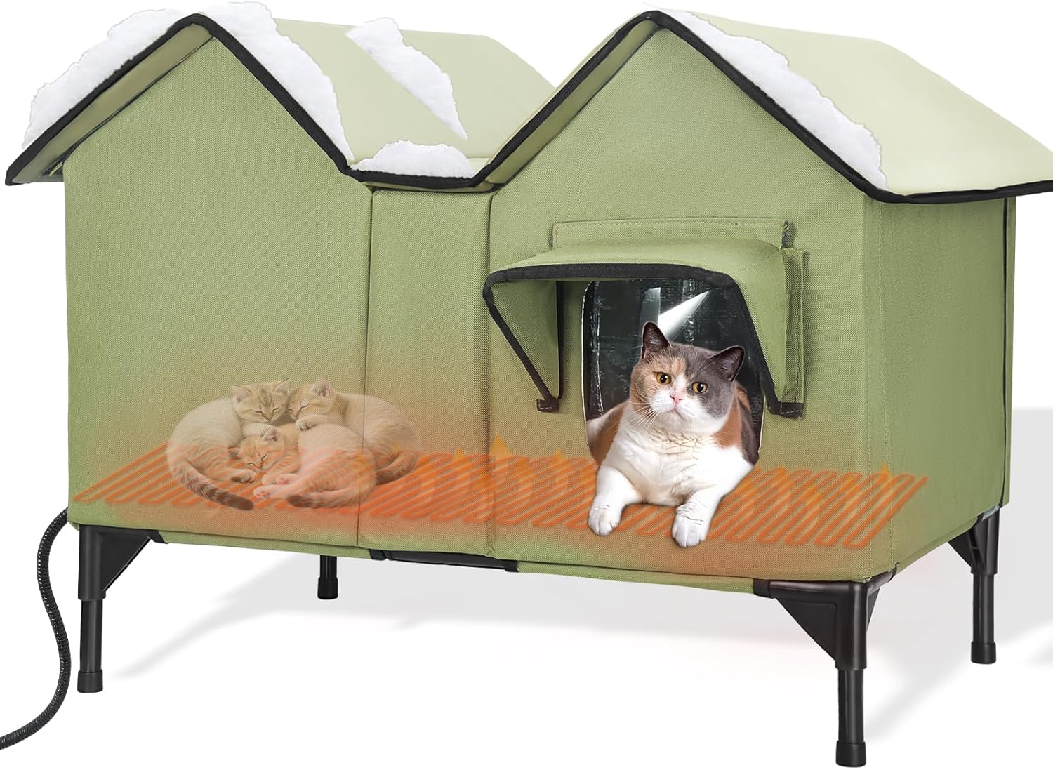 About this item Warm in Winter: Keep your outdoor cats cosy even in the harshest winter conditions with our heated cat house for outside. Equipped with an outdoor heating pad, it's perfect for keeping feral cats, community cats, stray cats, senior cats, and short-haired breeds like Siamese and Devon Rex warm and safe even in sub-zero temperatures. Weatherproof Cat Shelter: Our insulated cat house outdoor is built to withstand the elements. With an elevated base that keeps it off the ground, it prevents moisture from seeping in. Made from waterproof and durable materials, this cat houses for outdoor cats is designed to protect your feline friends in any weather. Safety and Durable: Built with safety in mind, our cat house features sturdy construction that resists collapse and wear. The heating pad is designed to be safe for pets, includes chew-resistant cords, an Overheat protector and a low-voltage heating system, providing peace of mind for you and a secure, warm shelter for your cat. Spacious and Comfortable: External measuring 30.5’’x19.5’’x21.8’’, it can accommodate 2-3 cats. Our extra large heated outdoor cat house provides a spacious and comfortable area where your pets can relax and stretch out, ensuring they have a comfortable and roomy shelter. Easy Assembly: The heated cat house can be fastened with Velcro for easy, tool-free assembly, and the base frame can also be installed without tools. The house should be placed in a covered place to keep out as much rain and snow as possible, such as garages, barns, sheds, porches, patios, or decks, etc. All-Season Use: While perfect for winter, our outdoor heated cat house is designed for year-round use. In warmer months, simply remove the heating pad to create a cool, shaded retreat for your cats, offering them a comfortable spot to relax in all seasons. › See more product details