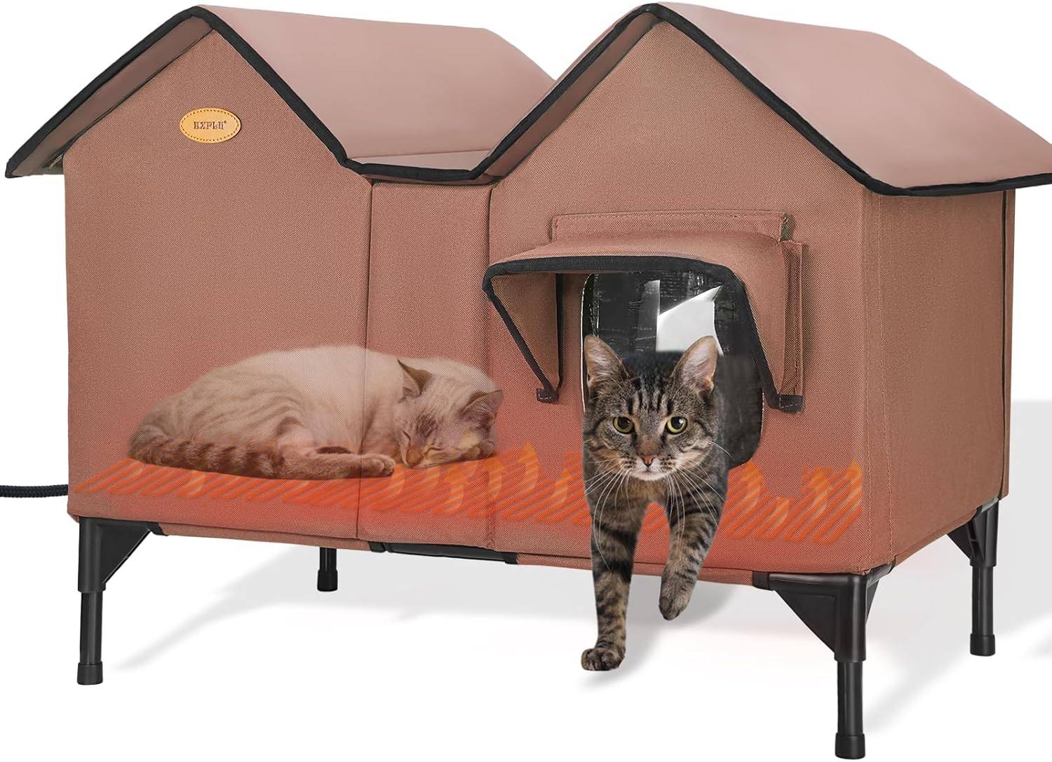 About this item 【Winter Shelter for Outdoor Cats】Designed specifically for feral, stray, and outdoor cats, HXPLN heated cat houses for outdoor cats provides a safe, warm shelter when temperatures drop, protecting your feline friends from colder winter. 【Large Size for Multiple Cats】This outdoor heated cat house Features a dual-room layout that comfortably accommodates two or more cats, allowing them to rest separately or snuggle together—perfect for multi cats, small dogs or other small animals. 【Safe & Efficient Heating Pad Included】The outdoor heated cat bed with a full-size, energy-efficient heating pad that maintains a cozy temperature. Chew proof cord, UL-listed for safety, it's ideal for cold nights and long winters. 【Superior Weatherproof & Insulated Protection】The outside cat shelter is made with durable 900D Oxford cloth fabric and built-in 1500 gsm high-strength hollow board as support, elevated off the ground to block cold and moisture, and lined with thermal insulation to reduce heat loss. It is not easy to tear or deform, ensuring long-term outdoor use in all weather conditions. 【Dual Escape Doors】Equipped with two exits so your cat is never cornered by predators. Each door includes a removable clear flap to keep out the chill while still allowing visibility and fast escape when needed 【Tool-Free Assembly & Easy Cleaning】Sets up in minutes with no tools required. The removable heating pad and waterproof interior make cleaning quick and hassle-free—just wipe it with a damp cloth, and you're done. › See more product details