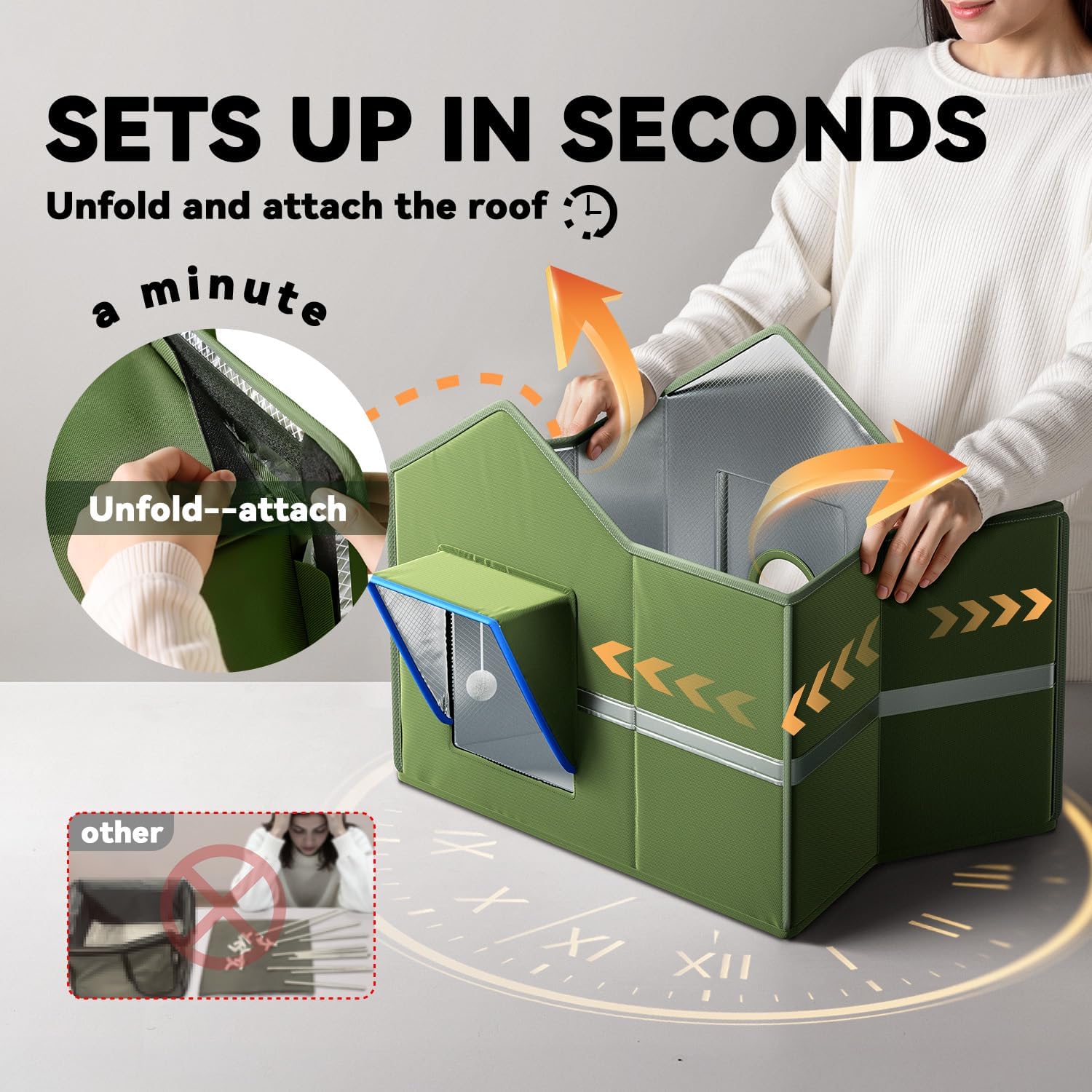 About this item Spacious Interior & Weight-Bearing Roof: Offers more room to relax than standard cat houses, easily fitting large breed cats or 2-3 small cats. The reinforced roof supports your cat lounging safely up top. A perfect cozy spot for your pet—whether in your home, office, garage, or outdoors. All-Weather Toughness: Keeps pets dry in rain and snow with a fully waterproof roof, removable PVC door flaps, and a raised base with 6 sturdy legs. Includes windproof straps and stakes for added stability in strong winds—so the shelter stays put, no matter what. Safety-First Design: Features two exits with heavy-duty magnetic one-way closures that keep predators out while letting your cat escape easily. Built with chew-resistant wiring and an ETL-certified heated pad (auto shut-off for overheating), so your pet stays safe outdoors—day and night. Tough, Warm & Built to Last: Made with thick, claw-resistant PVC-aluminum material and heavy-duty 600D Oxford fabric for superior insulation that stands up to weather and wear. The hollow-board design locks in warmth without trapping moisture—so your cat stays cozy and dry. Sets Up in Seconds & Easy to Peek Inside: No tools or complicated assembly needed—this shelter pops up ready to use in under a minute. Features a removable, machine-washable liner and includes a fun interactive toy ball. The top skylight lets you check on your cat easily and gives them a sunny spot to lounge in on nice days. › See more product details