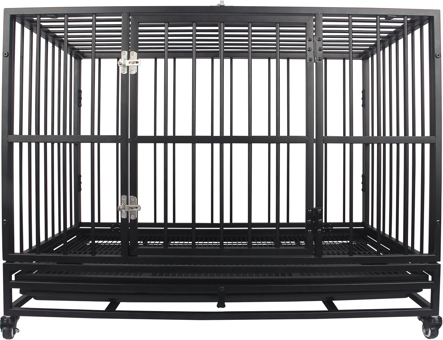 About this item Built with heavy-duty steel, a non-toxic, rust-resistant coating, and double latches, this indestructible dog crate offers superior durability and security. The front and top doors provide flexible access, while the reinforced steel and secure welds ensure your dog stays safe and contained. This large dog crate provides ample room for your dog to stand, turn, and lie comfortably, minimizing anxiety and destructive behavior, especially for dogs with separation anxiety. The dual-door design offers flexible placement and easy cleaning. A slide-out tray and a perfectly spaced floor grate make cleanup quick and easy. The grate allows droppings to pass through while providing a stable surface for your dog, both are easily removable for thorough cleaning. Equipped with four wheels, this heavy duty dog cage is easy to move and stable when stationary. Most parts come pre-assembled, requiring just 10 minutes to attach the wheels and bolts for a quick, hassle-free setup. Invest in a durable, escape-proof solution for your pet. Our heavy-duty dog crate features reinforced tubes, dual latches, and a design that supports crate training for a secure environment and peace of mind. Please ensure you have checked the measurements before ordering to ensure it's a good fit for your dog. › See more product details