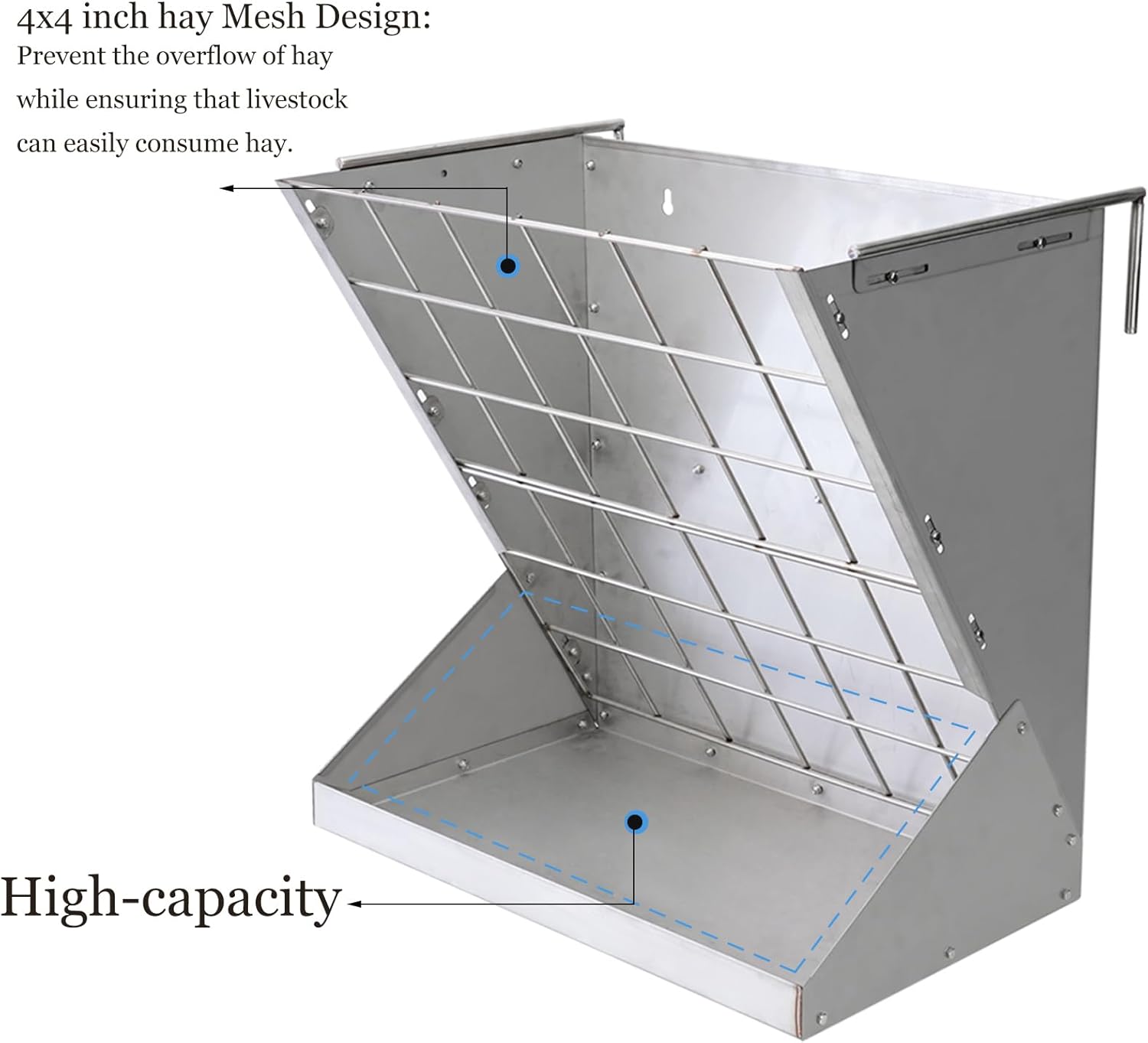 About this item Durable-Sturdy Material: This hay feeder is made of galvanized steel and iron net,heavy-duty metal frame construction for long-lasting use. Versatile Use: The livestock feeder can be wall mounted or hanging and free standing,can be widely used in the circles of cattle, sheep, horses,farms, stables, sheep shelters,barns,stalls; Hanging Goat Feeder: This double L-hook is convenient to installation and the distance is adjustable,can be installed in various places,the hay rack with tray can be simultaneously storage hay grain and mineral feed,simultaneously catering to different types and size of livestock,It is a necessary tool for family farms, etc. Large Capacity and No Waste: 2 In1 horse feeder approx can hold 26 gallon food,The spacious hay rack with deepening grain tray is very suitable for goat, sheep,horses, etc;the 4x4 metal mesh design can prevent goats/horses from swallowing too much food at the same time, reduce hay spillage, and prevent waste. Service: Accessories and installation tools are included in the packaging. If you have any questions about product install or other,please don't hesitate to contact us!the customer satisfaction is our greatest achievement. › See more product details