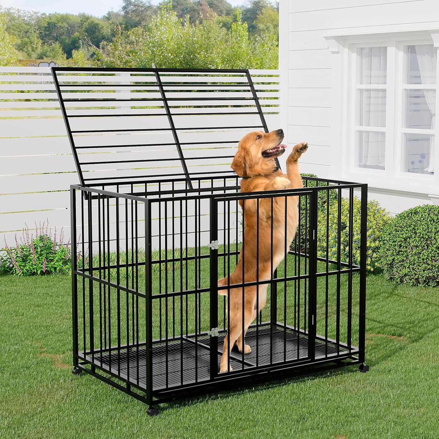 best Heavy Duty Dog Crate for Large BreedsProvide your beloved canine companion with the security and comfort they deserve using our 48-inch Heavy Duty Indestructible Dog Crate. Expertly engineered from high-quality stainless steel, this dog kennel is designed to withstand even the most determined escape artists and aggressive chewers. The robust construction ensures long-lasting durability, making it perfect for XL breeds and energetic large dogs.Escape-Proof & Chew-Resistant: Reinforced steel frame and secure door locks prevent escapes and resist chewing, giving you reliable.Indoor & Outdoor Versatility: Furniture-grade finish seamlessly fits indoors, while the weather-resistant build makes it appropriate for outdoor placement as well.Convenient Mobility: Equipped with locking wheels, this heavy-duty dog cage is easy to move and securely lock in place wherever you need it.Space-Saving & Collapsible: The collapsible design allows for easy storage and transport, ideal for home use or travel.Spacious Comfort: The 48-inch interior provides ample space for large and extra-large breeds, ensuring your dog can relax and move freely.Whether for training, travel, or providing a safe haven at home, this stainless steel dog crate combines indestructible strength with practical convenience. Trust in a kennel that truly delivers security, mobility, and style for your pet. Perfect for dog owners seeking a reliable, chew-resistant, and escape-proof solution for their large or XL breed dogs.