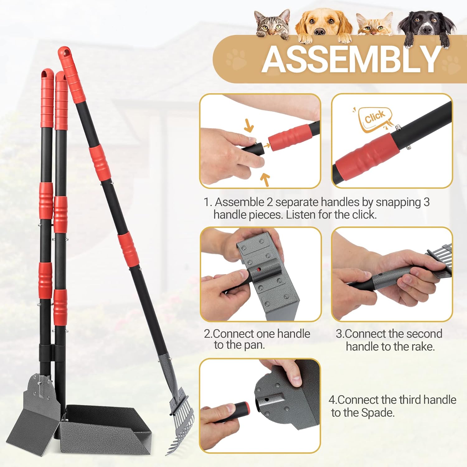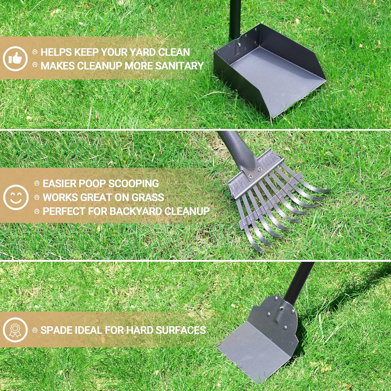 Heeyoo Pet Poop Tray and Rake Pooper Scooper KitAs pet parents, we always face a challenge with the pet’s pooper. Heeyoo metal pet poop tray and rake provides a convenient and comfortable way to clean easier and quicker. We use upgrade clip-on interlocking design, no more spinning around or easy dropping, one person can assembly and disassembly in one minute. Made of rustproof metal material, you only need clean by hose off after using.Package:1 metal tray1 metal spade1 metal rake1 pc link9 stainless steel tubes