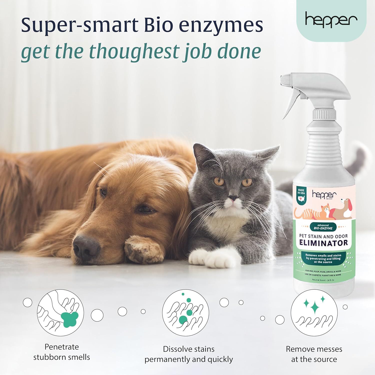 About this item ADVANCED ENZYMATIC CLEANER - Penetrates the most stubborn smells and stains at the deepest molecular levels to dissolve any pet mess you encounter and lift it away at the source. FOR ANY MESS, ON ANY SURFACE - This pet odor eliminator cleans your carpets, floors, furniture, fabrics, and more. Whether it's urine, feces, vomit, or drool, you can erase all foul spots and smells! FRESH, NATURAL ODOR - Our unique formulation doesn't rely on dangerous or unpleasant chemical fragrances to get the job done. We eradicate smells and stains, not just cover them up. NO TOUGH SCRUBBING - Simply shake, spray, and wait. Before you know it, your home is fresh once again, and you didn't even need to get down on your hands and knees to clean! › See more product details