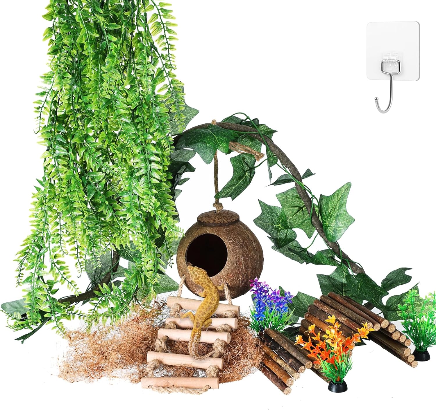About this item Create Real Habitat Environment: These vines are bendable, twistable life-like vines with a natural feel and look and can be twisted together with vines of different sizes to create a 3-D habitat. Package include: Coconut house is made of 100% natural coconut, making it safe for pets. 14.9inch-1x coconut house, 3.3ft-1x reptile vine, 1 x Wood Bridge, 1 x Reptile Hanging Plant, 3x Stand plants, 1 string of leaves, 1x coconut fiber. Perfect Hiding Place: Encourage reptiles to exercise and increase interest activities. Fun and cute hiding place for your lizards to build a nest. In order to kill time, they found them climbing on the shells to rest. Climbing Ladder: HERCOCCI coconut shelter provides the perfect hollow space for placing food or when they just want to nap in a sheltered space. Ladder serves as a bridge to go across the enclosure. Wide Range of Pets: Reptile toys is suitable for Reptiles, Arthropods, Arachnids, Crabs, Hermit-Crabs, Frogs, Geckos, Iguanas, Lizards, Newts, Salamanders, Snakes, Spiders, Tortoises, Turtles, Ball Python,Corn Snake › See more product details