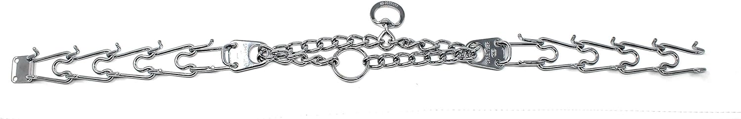 The Herm Sprenger Chrome Plated Steel Dog collar is one of the most recognizable and popular names in obedience training tools. A safe and effective alternative to choker collars, it puts even pressure around the neck, about every half inch, putting the skin in a band. This collar does not apply direct pressure to the trachea, so you can train your dog with little or no tugging, jerking, or pulling. The addition of a center plate connector allows the middle link to be configured symmetrically, enabling the links to tighten in the same direction. Made of high quality German steel, The size of this collar can be adjusted by adding or removing the links individually. Features: interlocking links, each link equipped with two blunt link tips slips over dog's head for easy on, easy off slightly beveled link tips easy to increase or decrease in size. Links sold separately. These collars come in four sizes Small 2.25mm x 16”, Medium 3mm x 22”, 3.2mm x 23” and 3.9mm x 25”. Sizing instructions: collar should fit snuggly just below the dog's ears, measure the circumference of dog's neck and add 2". Please note: Not recommended for light color dogs.