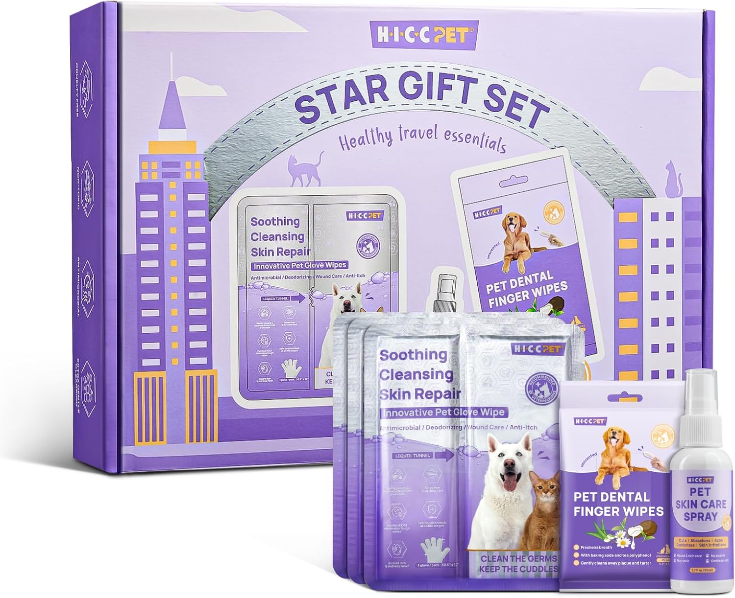 Includes 1 bottle of anti-itch spray, 1 pack of dental wipes (25 pieces), 3 packs of hypoallergenic glove wipes. Designed for pets with skin problems that prevent them from being cleaned. Such as hot spots, allergies, wounds, etc. 【Multiple Effects Spray】1. Helps heal and prevent hot spots, dermatitis, rashes, itchy skin, scratches, wounds and other skin problems. 2. Help accelerate pet wound healing. 3. Relieves most skin allergy symptoms. Note: Spray 3-4 times each time, twice a day for better result. Designed specifically for cleaning and deodorizing pets, it can effectively and quickly remove odor, dirt, and dander, improve dry fur problems, and give pets healthy and shiny fur. Especially suitable for cleaning your dog after a walk or outdoor activity. 【Pet Teeth Cleaning Finger Wipes】Just wipe gently with the Dog Teeth Cleaning Wipes to instantly remove tartar and plaque and freshen your dog's breath. Unique patented organic coconut oil fermentation technology, ideal for dogs and cats with sensitive teeth, gums and enamel. 【Hypoallergenic and Gentle】HICC Pet Sterile Dog product adopt a special natural formula that is gentle and non-irritating, suitable for pets of all ages, even sensitive. Contains no alcohol, fluorescent whitening agents, dyes, etc. LICK SAFE. We take responsibility for each and every one of our customers and furry children. › See more product details