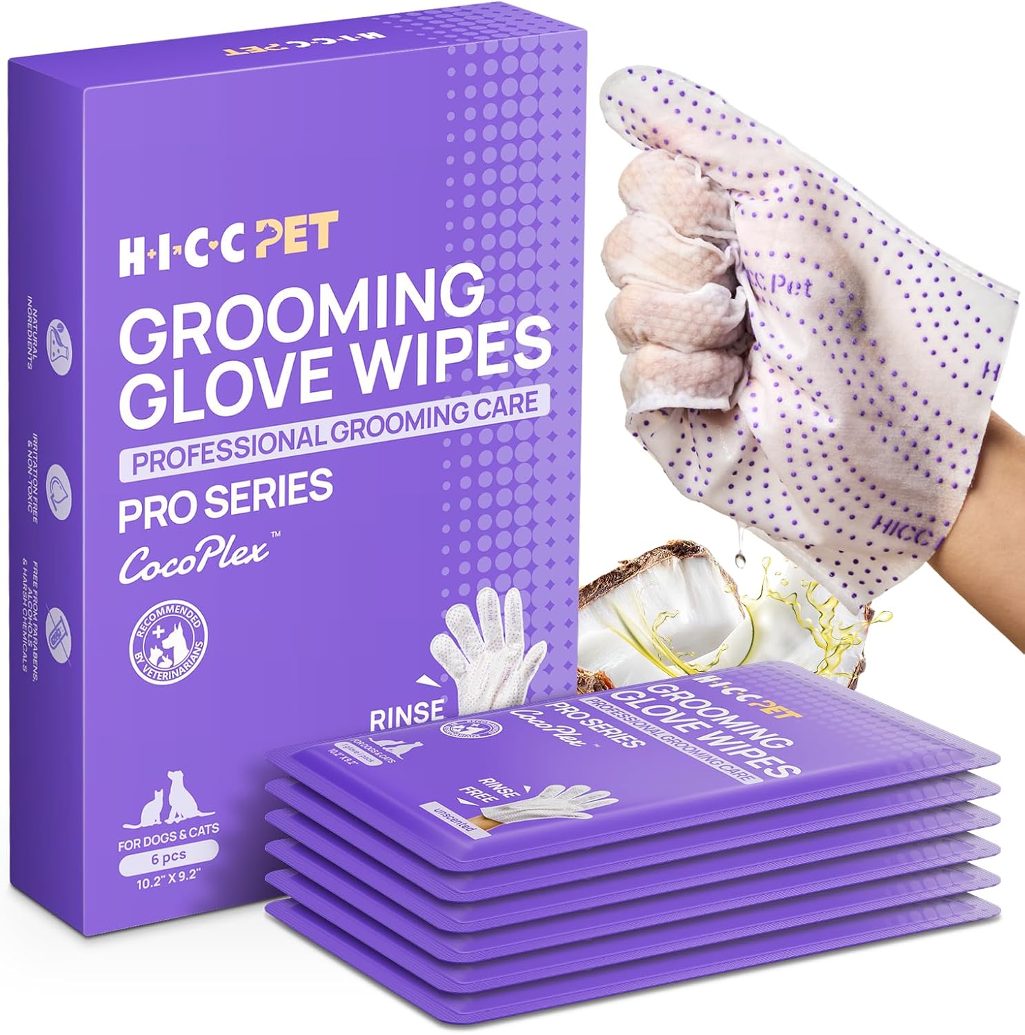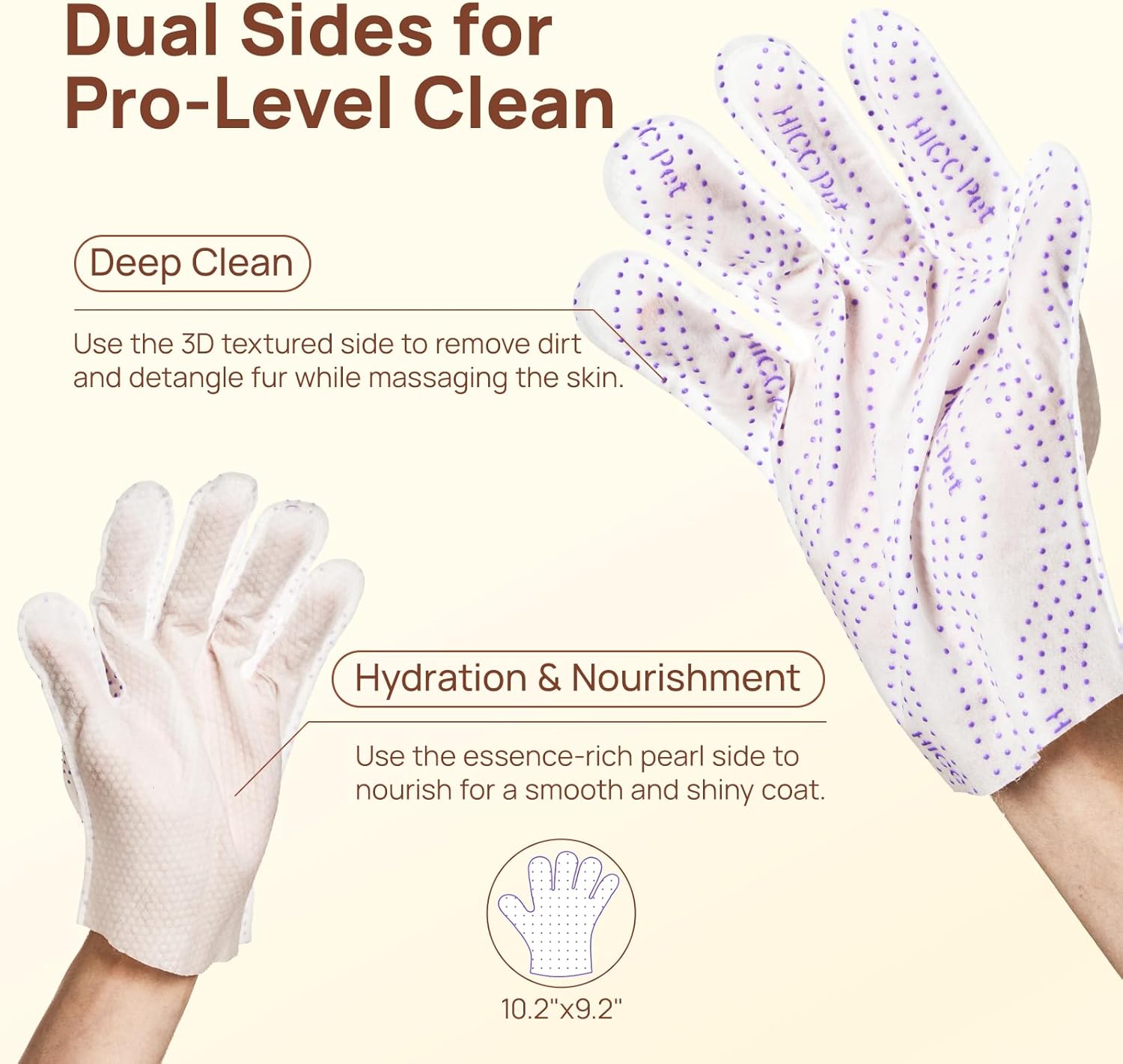 HICC PET Glove Wipes Pro Series are extra-thick, dual-textured pet wipes for dogs, cats, rabbits, and horses. Designed as easy-to-use grooming glove wipes, they offer deep cleaning, gentle combing, and soothing massage in one step. Infused with fermented coconut oil and a nourishing blend of botanical extracts, they leave your pet’s coat clean, soft, and fresh—without water. Perfect for travel, camping, cold weather, or pets who dislike baths. The easiest clean is at your fingertips.